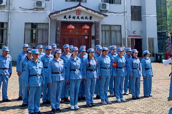 身穿军装的游客聚集在民丰村党群服务中心前,“立正、稍息、向左看齐……”响亮的口号在广场中央响起,大家列队站立着,聆听着老党员深情讲述的老一辈共产党人的革命故事,重温那段艰苦奋斗的革命岁月,感悟革命先辈艰苦奋斗、百折不挠的革命精神。