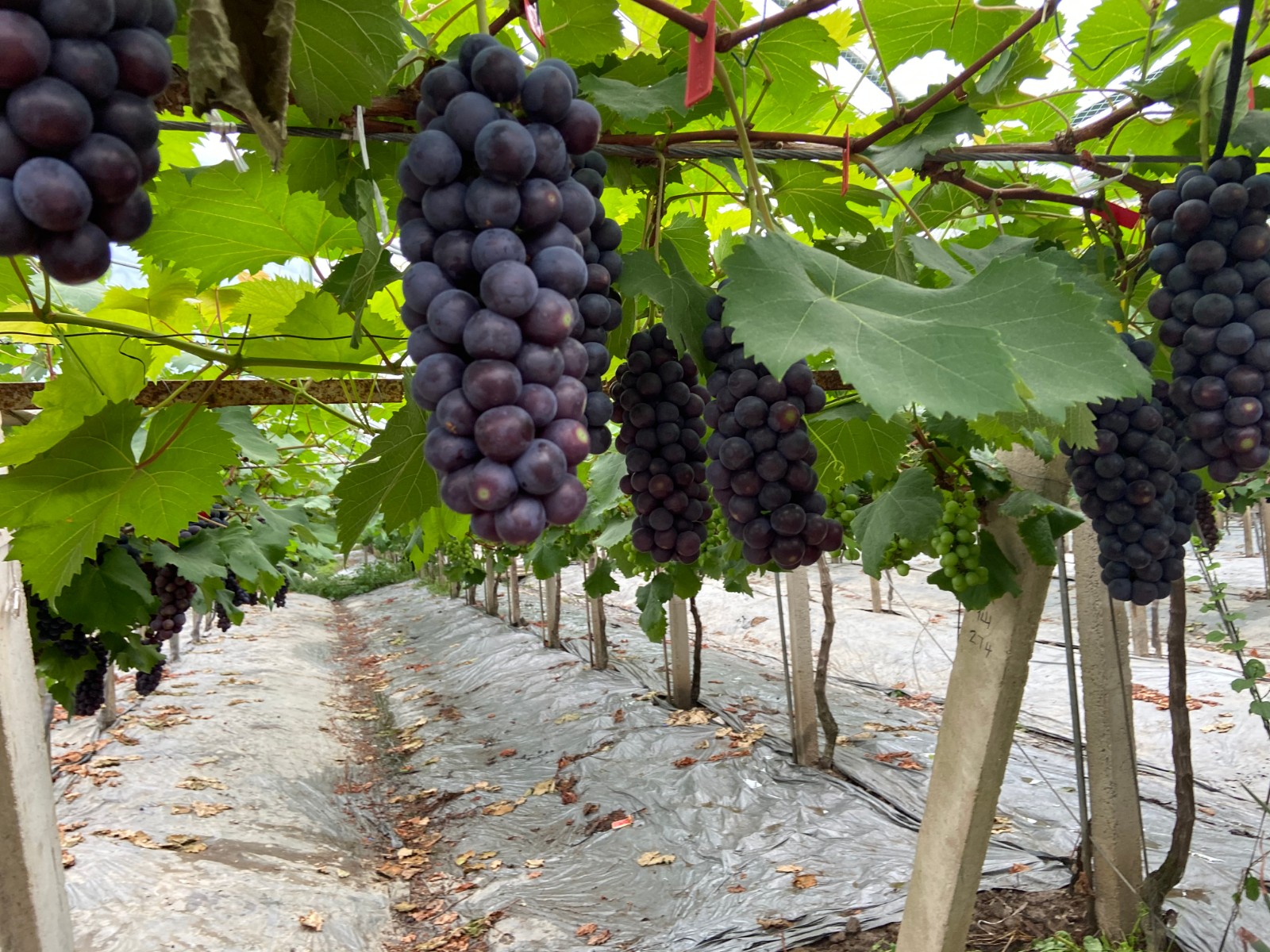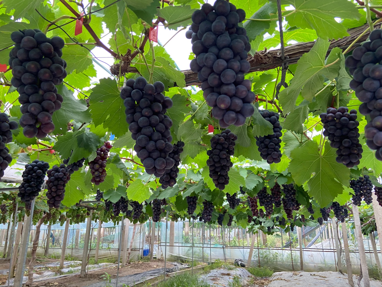 在葡萄基地里,干焕宜专家乐呵呵地给大家介绍起这株新品种:“这株新品种我已经培育了8年多了,而且表现稳定。该品系与目前栽培的‘早夏黑’品种相比,品质更优,可溶性固形物含量可达18%以上,比‘早夏黑’高1-2%;其次果实无涩味,具鲜甜感,带玫瑰清香。”接着干焕宜专家又道:“该‘新品种’在三膜覆盖栽培的条件下,成熟期同‘早夏黑’相仿,但比当下明星品种——‘夏黑’要提早15天左右,在生产上表现为着色伴随果实膨大同时进行,生长期相应缩短,说起来还很有优势。” 据了解,该品种产量高,亩产可达到3500斤左右,果实上色一致,植株花芽形成好,基本为双花穗。