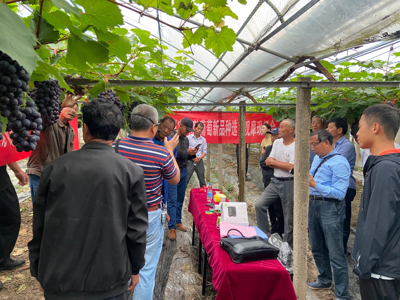 “这株新品种暂命名为‘夏宜玫瑰’,是2012年在该基地11年生‘夏黑’品种植株上发现的芽变优系。经过8年多的跟踪调查研究,该品种生长与结果习性趋于稳定,具有母本‘夏黑’品种习性,表现为果实成熟早、糖度高、着色一致、具有玫瑰香味以及植株丰产性好……”临山成校倪刚校长及学校教务部、培训部一行人在临山镇干焕宜葡萄基地正带领着葡萄种植户们一起观摩“新品种”葡萄的概况,共同聆听葡萄专家的选育栽培经验。