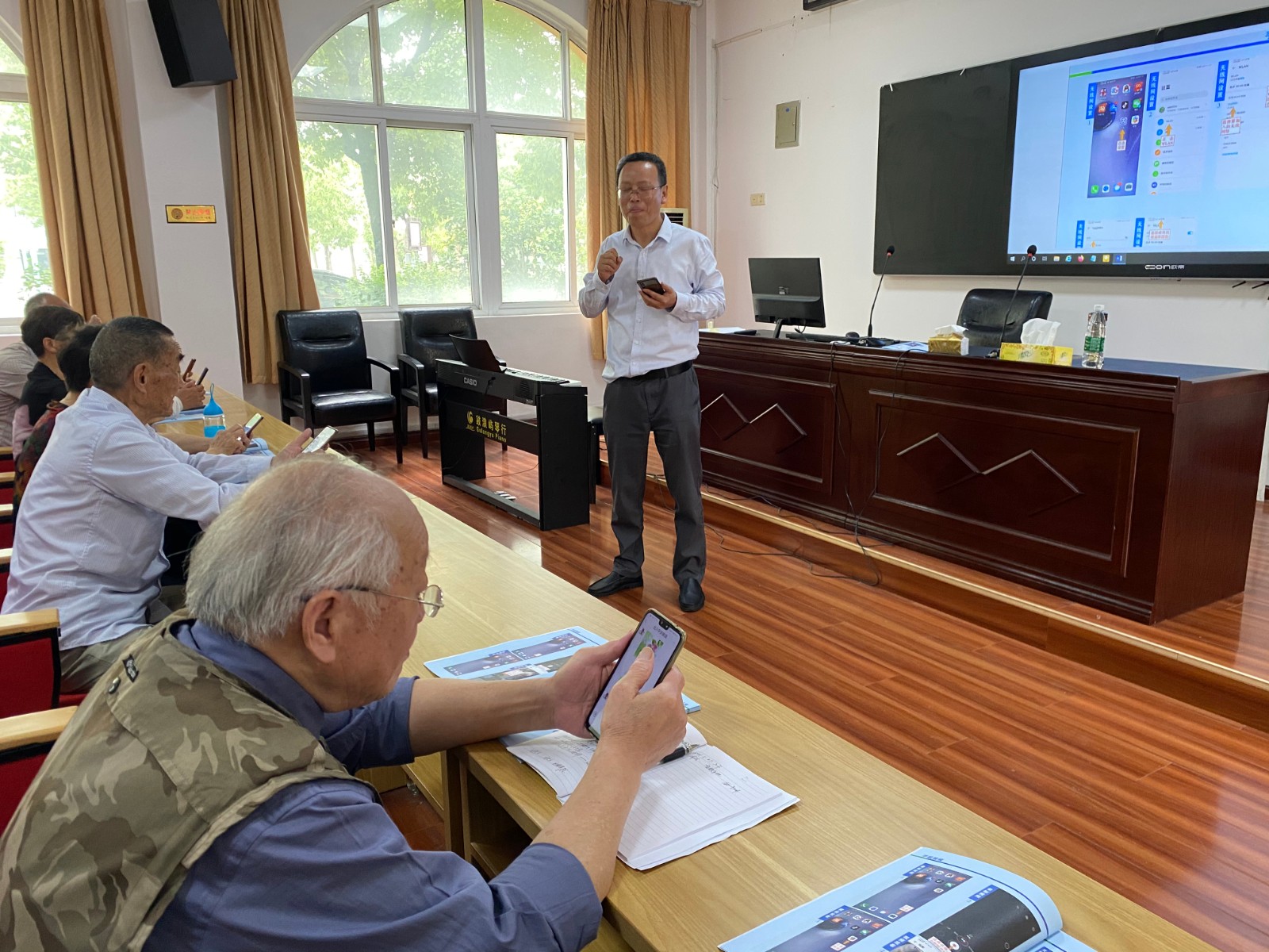 成校励迪校长亲自为老年学员授课,他通过PPT讲解和手机操作指导相结合的方式,教授老年人关于微信加好友、建群、及时撤回信息、正确发送下载照片视频等一些简单实用易懂的操作。老人们学习热情很高,纷纷拿起手机向老师提问请教,授课老师手把手为老年人演示操作,受到老年人的欢迎。