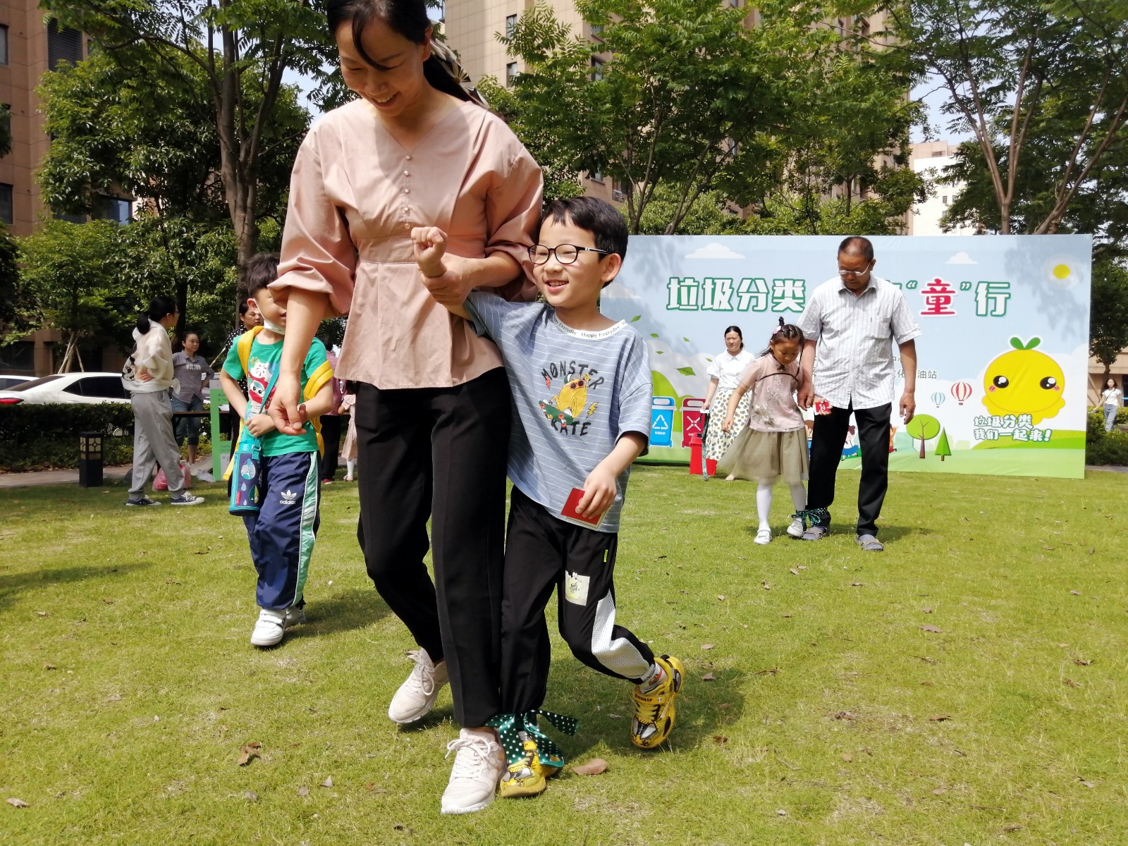 在老鹰抓小鸡游戏中,家长作为“老鹰”,而孩子们化身“小鸡”,头戴贴有生活垃圾的帽子,“老鹰”根据抽到的垃圾桶种类抓住了对应的“小鸡们”。“抓到了,抓到了!我一抽到有害垃圾桶卡片,就迅速‘锁定’了其中的过期药品、油漆桶两只‘小鸡’。”作为“老鹰”的居民王女士说道,“老鹰抓小鸡游戏我们小时候经常玩,有很多美好的回忆,这次带着孩子一起参与,既学习垃圾分类知识,又重温了老底子游戏,非常有意义。”随后,还有两人三足小游戏,家长和孩子共同迈步,将生活垃圾卡片贴到了相应垃圾桶展板上。