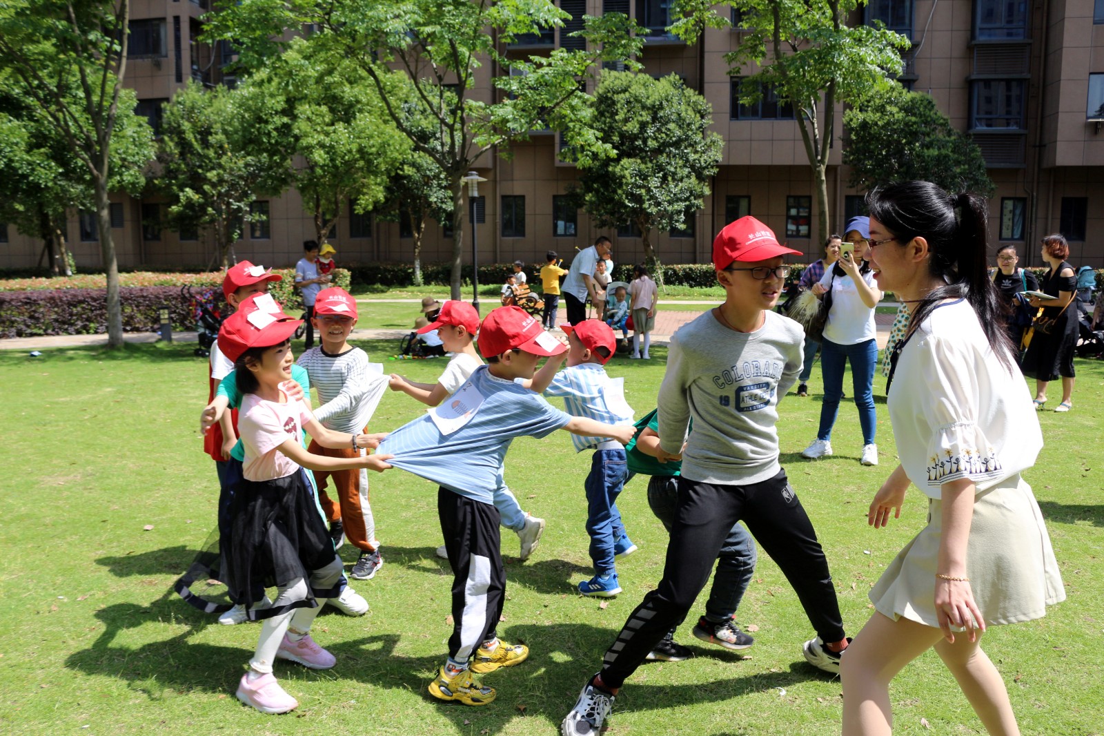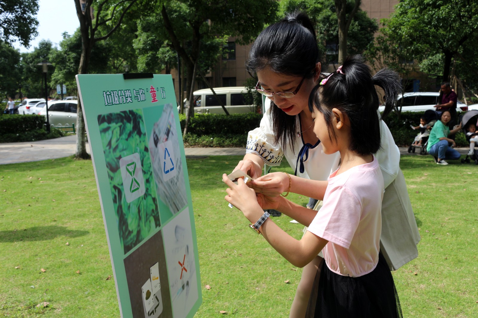 活动现场,丢手绢、老鹰抓小鸡、两人三足等老底子游戏融入了垃圾分类元素,接续进行。“丢垃圾,丢垃圾,轻轻地放在小朋友的后面,大家不要告诉他,快点快点分一分,红黑蓝绿哪个家?”草坪上传来了熟悉的《丢手绢》旋律,大家唱着创意改编的新歌词,玩得不亦乐乎。写有垃圾名称的卡片在游戏过程中,被小朋友们准确无误地丢进了垃圾桶内,帮“垃圾”找到了“家”。