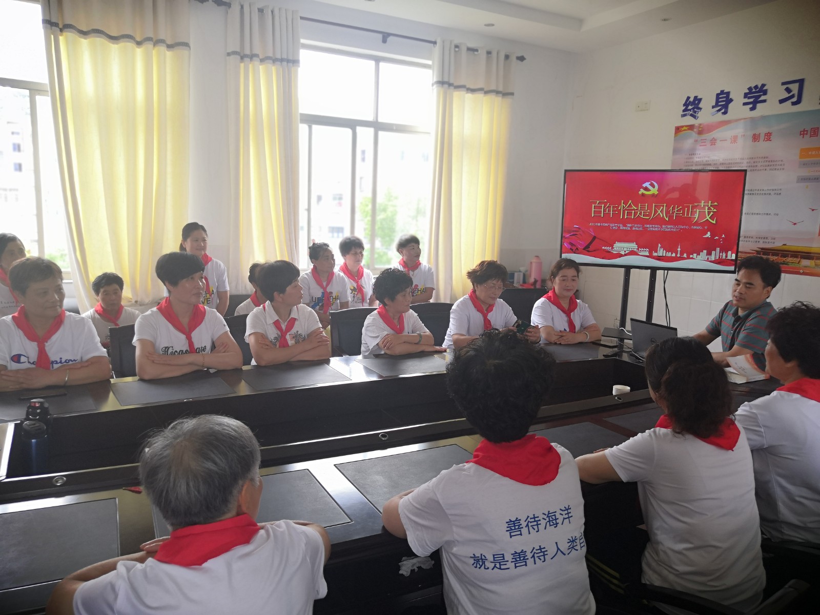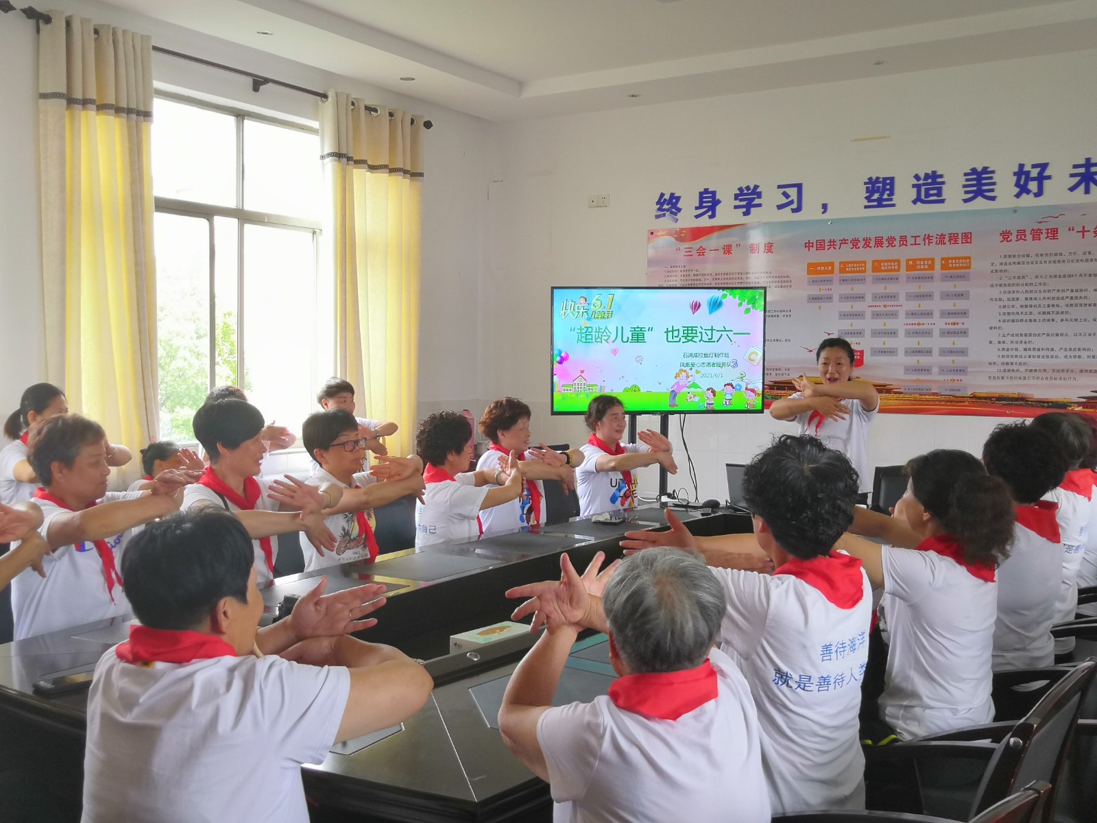 6月1日,石浦镇老年大学的部分学员和社区志愿者也跟着快乐起来,她们系上红领巾,听党课,升国旗、唱歌跳舞,做游戏,学手语,仿佛回到了童年时代。