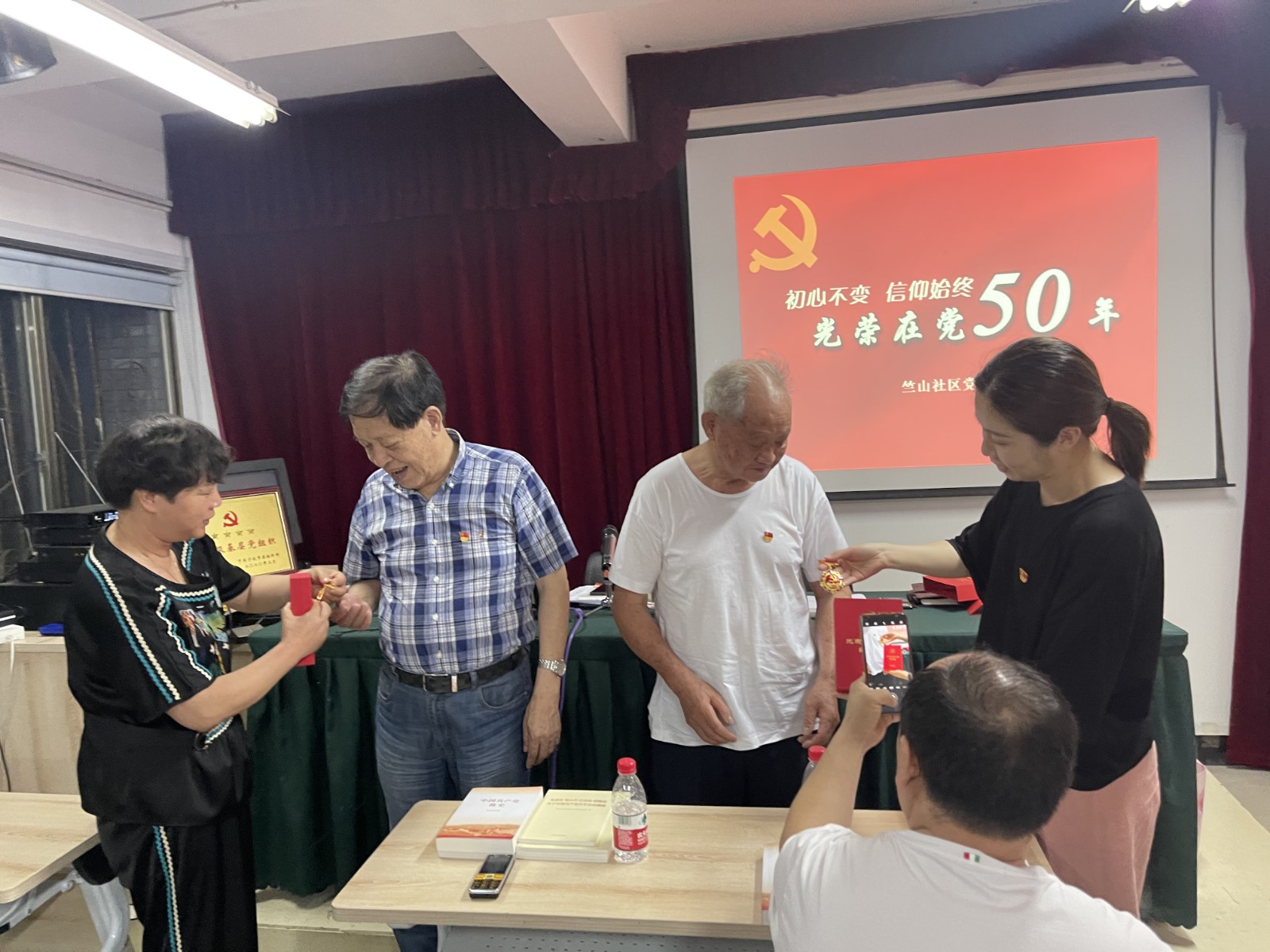 会上街道联社区领导向坚芳主任为全体党员送上《学党史 强信念 跟党走》党史专题党课。随后向坚芳代表街道党工委向党龄达到50周年的老党员颁发“光荣在党50年”纪念章,对他们入党以来为党、为人民所做的贡献表示衷心的感谢。之后,全体党员观看誓词教育专题片《看齐》,并一起在庄严的党旗下重温了入党誓词。最后,各支部召开组织生活会,党员进行党性分析,开展批评与自我批评,查找问题与不足,落实整改措施。