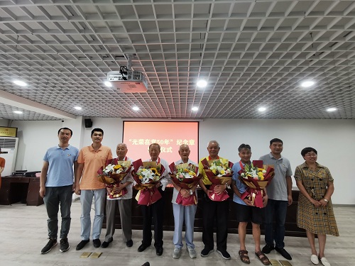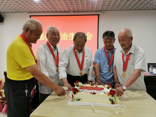 接下来,涂奔同志和社区党总支书记叶静君同志共同为5位党龄超过50年的老党员颁发了“光荣在党50年”纪念章并送上鲜花。颁发仪式在雄壮的国歌声中进行,老党员们非常激动,他们神情凝重,流露出对党无比热爱之情。拥有64年党龄的王佐泉和冯纪相两位老同志作为代表进行了发言。冯师傅说:“我今年87岁了,从20出头入党到现在,因为党,因为组织,这些年我的日子越过越好。”一旁的王师傅补充说到:“我跟着党一起长大,从那些年的苦日子到现在幸福生活,从当年的毛头小伙到现在膝下子孙满堂,党员两个字几十年如一日的刻在了心里,我始终不忘。”在老同志门戴上纪念章的那一刻,台下的年轻党员齐声鼓掌。“这些老党员的党龄比我的年纪还要大,没有他们当年的辛勤付出,哪里有我们现在的安稳生活。他们是我们的学习榜样。”年轻党员小杨激动地说。