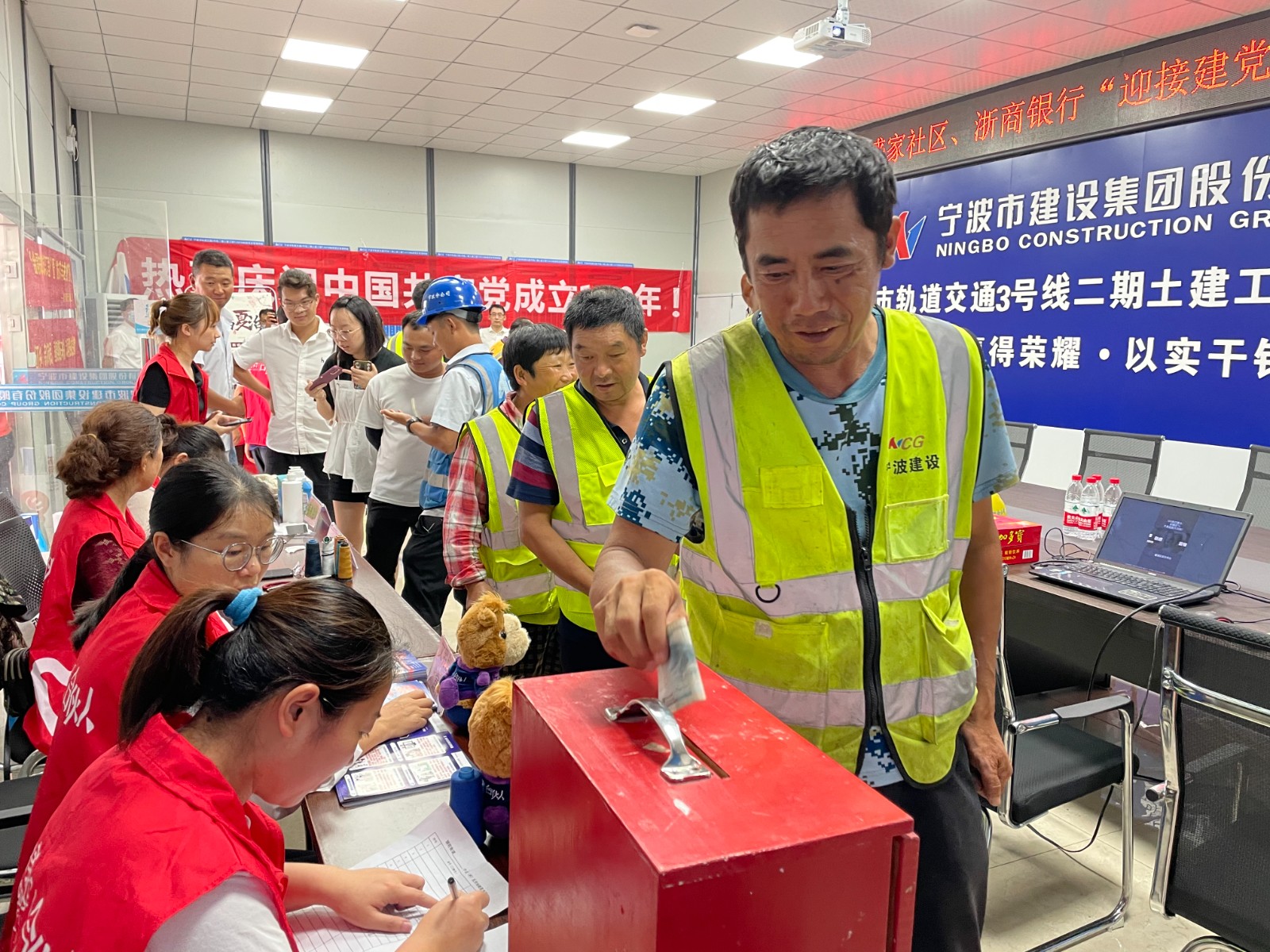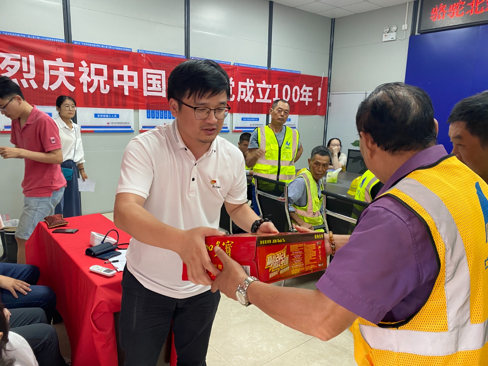 5.社区党总支为建筑工人送去清凉解暑饮品。