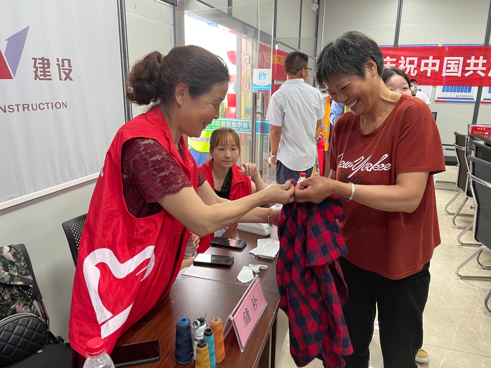 4.为满足建筑工人需求,现场设有理发、中医推拿、补鞋、缝补、手机贴膜、政策宣传等深受建筑工人欢迎的便民服务项目,解决了建筑工人们实际生活中的问题,增进了党群关系,将“学党史”理论成果转化为“办实事”实际效能。