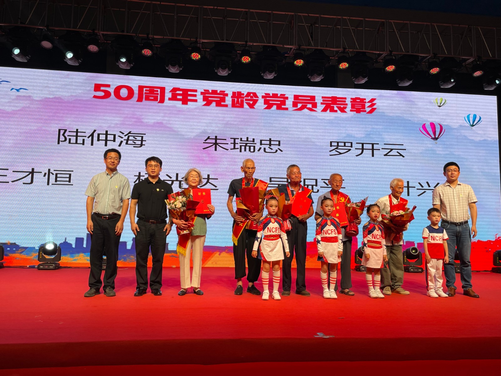 紧接着街道领导上台为辖区7名50周年党龄共产党员颁发“光荣在党50年”纪念章,并送上绶带和鲜花,不仅增强了党员的荣誉感、归属感和使命感,真正将党的温暖和关怀送到老党员的心坎里。