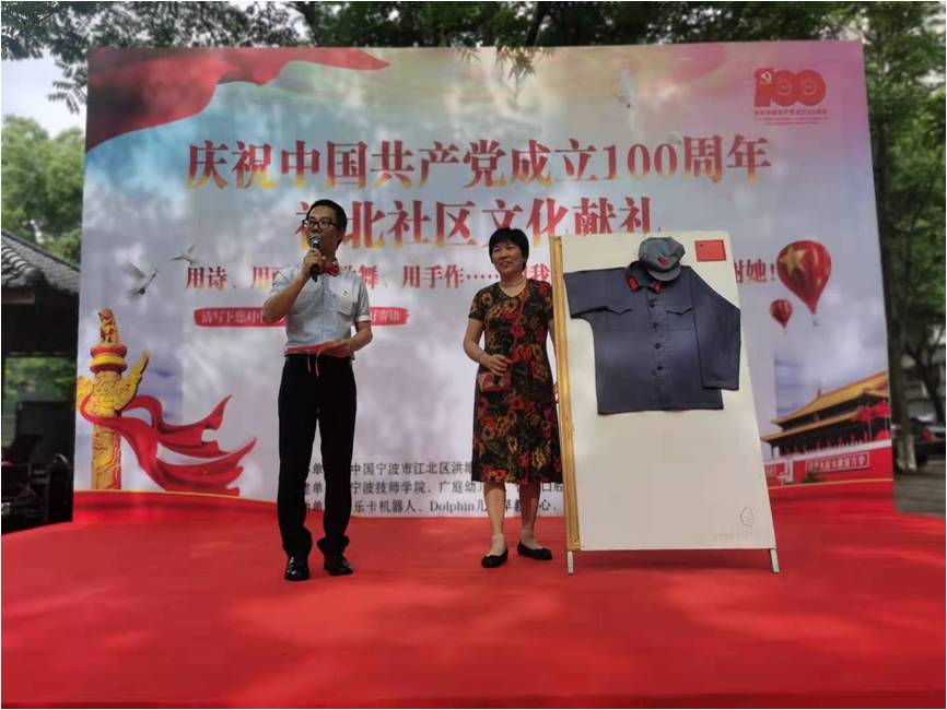 我们的居民袁阿姨是中共党员,在得知这场文化献礼活动的时候就在第一时间提议要献上这支舞蹈《绣红旗》来表达对党的敬意。经过1个月的排练,10位阿姨呈现出了一支优美的舞蹈,赞美我们的党和祖国。技师学院的学生原创赞美诗《有一首歌》,赞美100年的风雨历程、歌颂100年辉煌历史,在每一个关键时刻,在每一次重大关头,都是我们伟大的中国共产党,把握历史大势,顺应时代潮流,带领人们,依靠人民,不断开创革命和建设事业的新局面。还有厨艺作品果胶画展示,红旗、红船、长城一幅幅红色画作,展现学生们的创作热情。祥北社区手工达人王玉飞上台展示她亲手制作的红军服。王玉飞的外公曾经是老红军,一张老照片里的红军服正是他今天创作的灵感源头,找寻红军服的布料、纽扣、帽子等都花了不少心思。红军服仿制得十分相像。王玉非也是我们社区社会组织缝纫机乐队的队长。她想通过这幅作品表达对党和祖国的热爱!在节目表演之余,还穿插了3个党史竞赛的环节,共15道题目。现场居民踊跃参与,不断将活动推向一波又一波的高潮。