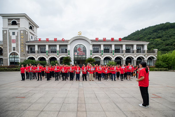 8点半,升旗仪式正式开始。伴随着国歌,鲜艳的五星红旗冉冉升起,点燃在场党员的满腔热情,他们身着红色T恤,手执党旗、胸佩党徽,挥舞着手中的旗帜,拼成“100”字样,场面十分壮观。