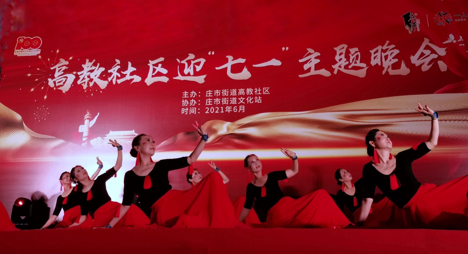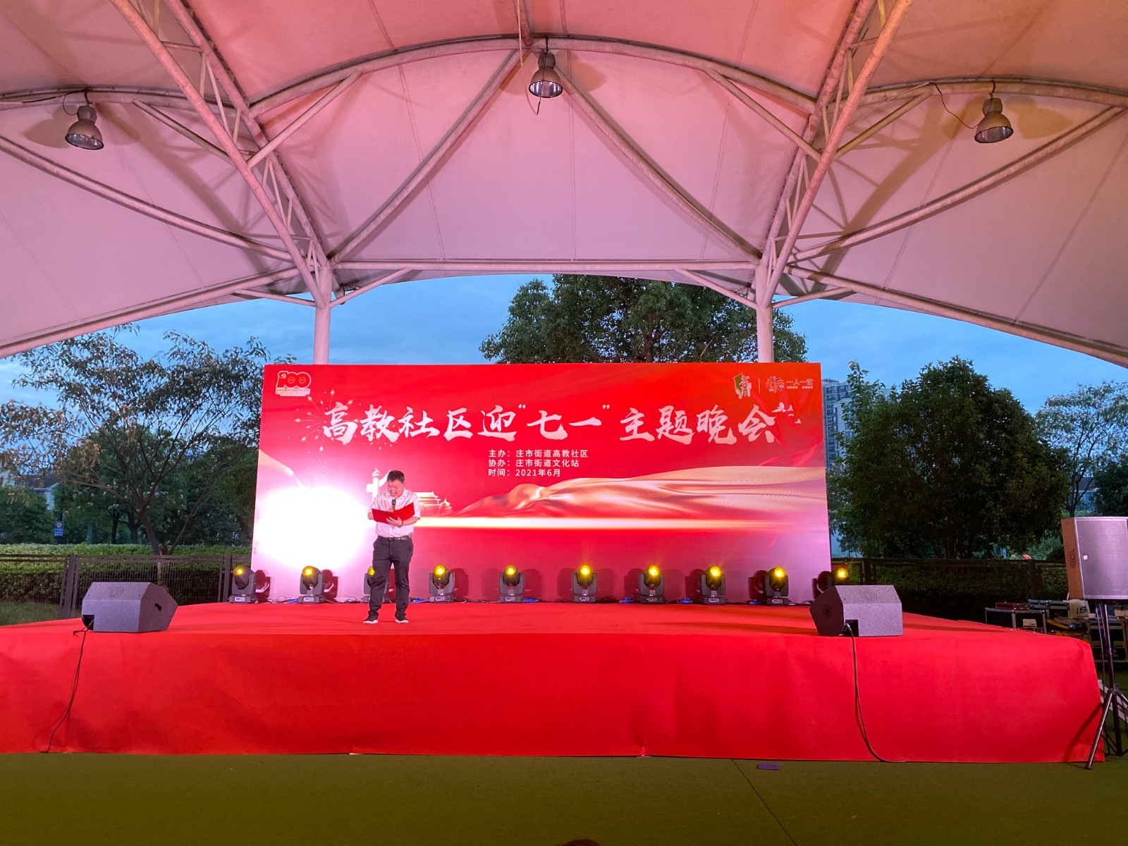 高教社区党总支庆祝建党100周年主题文艺晚会在绿轴体育公园门球场内隆重举行,来自辖区的党员干部、居民代表、共建单位及周边居民前来观看。