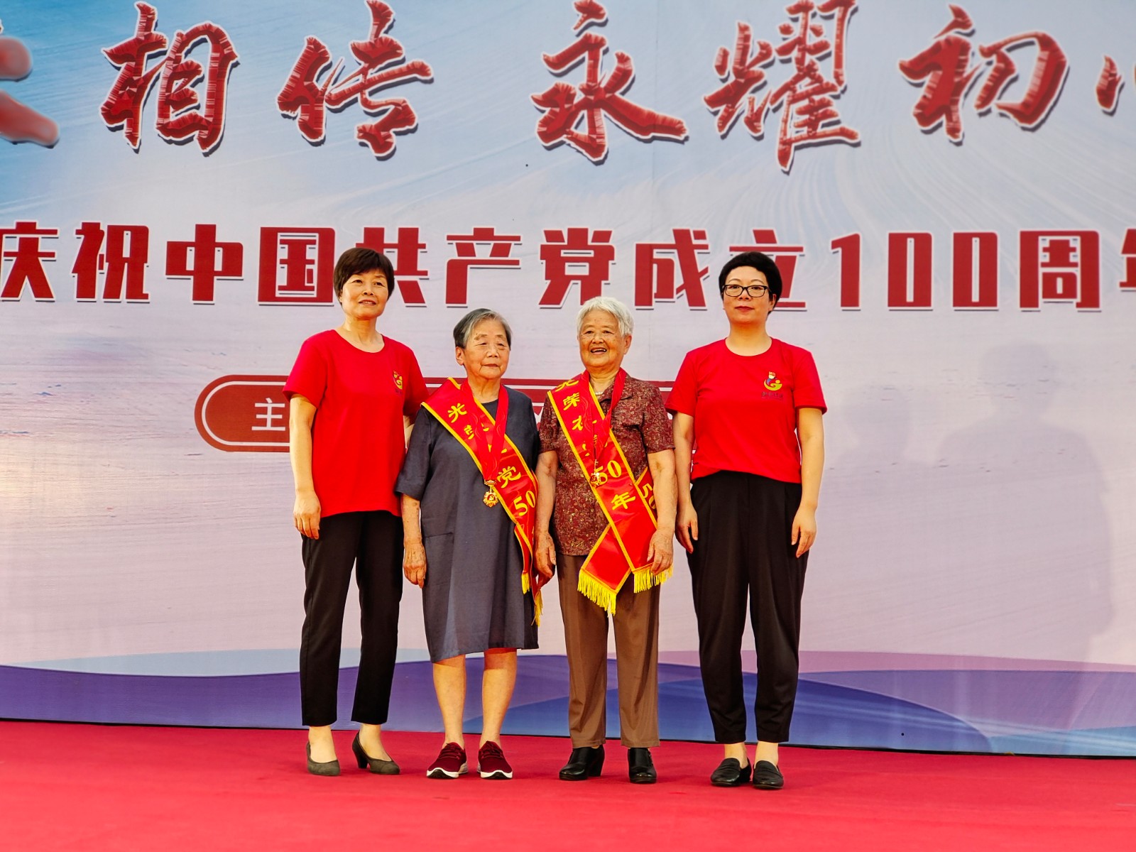 6月29日晚,静远社区党总支开展“薪火相传 永耀初心”庆建党百年火炬传递活动,下属华南、华北、锦尚、融合、“银辉”五个支部党员通过火炬传递的形式,共同翻阅“红船起航篇”、“革命篇”、“建设篇”、“改革篇”、“强国篇”,重走1921-2021中国共产党百年辉煌历程。活动现场,连心解忧单位第七医院的20余个科室医生为辖区居民带来健康咨询义诊服务。主舞台上,玫瑰湾幼儿园、骆驼城管中队、社区社会组织带来精彩的红色歌舞节目,联社干部为两位党龄超过50年的老党员颁发“光荣在党50年”纪念章,陆华芬主任、郑耀主任及刘维君书记共切生日蛋糕,在《唱支山歌给党听》的大合唱中,全场党员群众共同为党庆生!