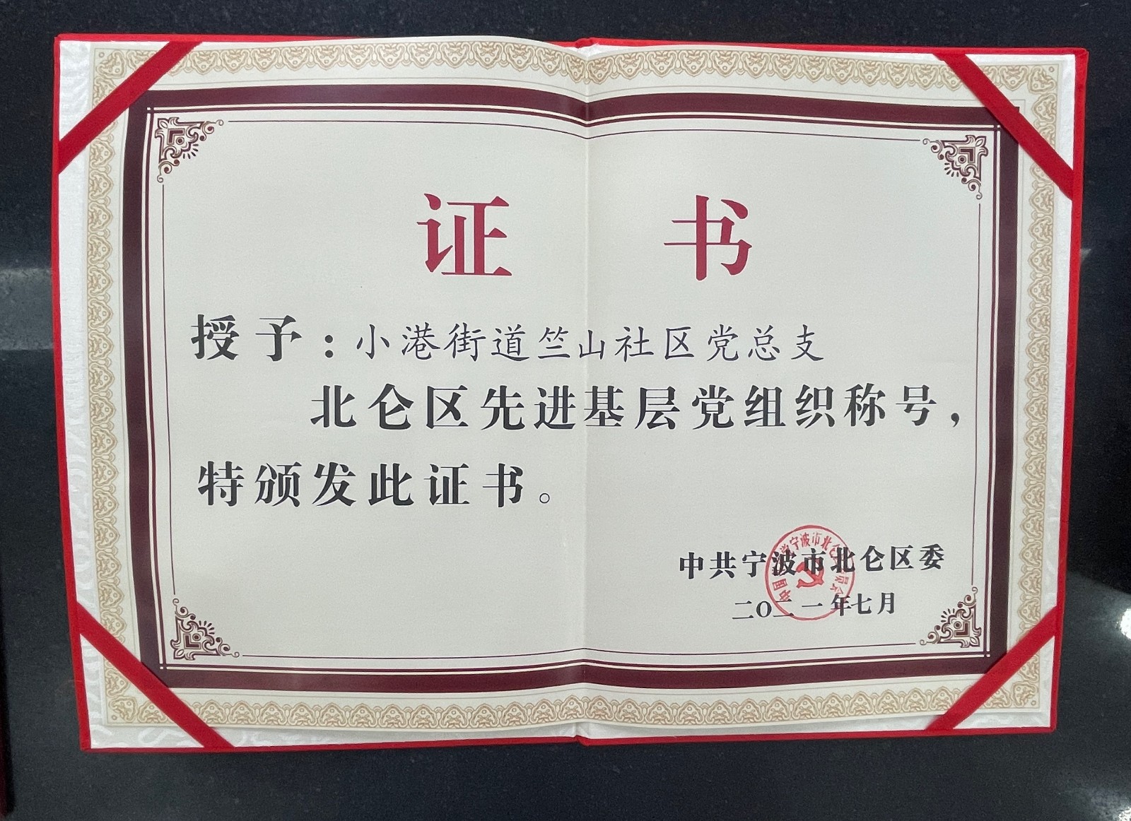 6月28日晚上,宁波市北仑区委对全区先进基层党组织、优秀共产党员、优秀党务工作者进行了表彰。小港街道竺山社区党总支被授予“先进基层党组织”称号。