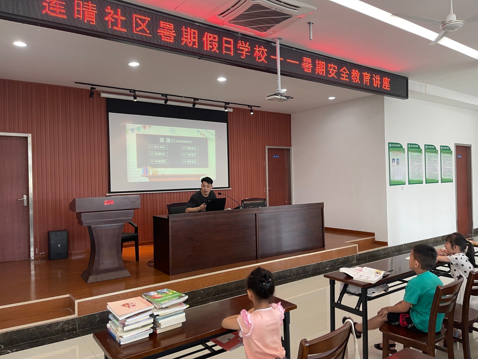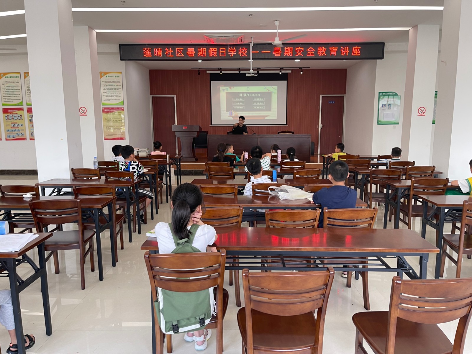接着社区党总支副书记为小朋友们带来了一场精彩的暑期安全主题教育讲座,围绕防止溺水、交通安全、防骗防拐、消防安全、气象安全、居家安全六个方面进行展开,并且结合一些生动形象的案例,给小朋友们进行了安全知识的普及,同时以提问的方式进行互动,小朋友们一个个积极举手抢答问题,现场气氛十分融洽。