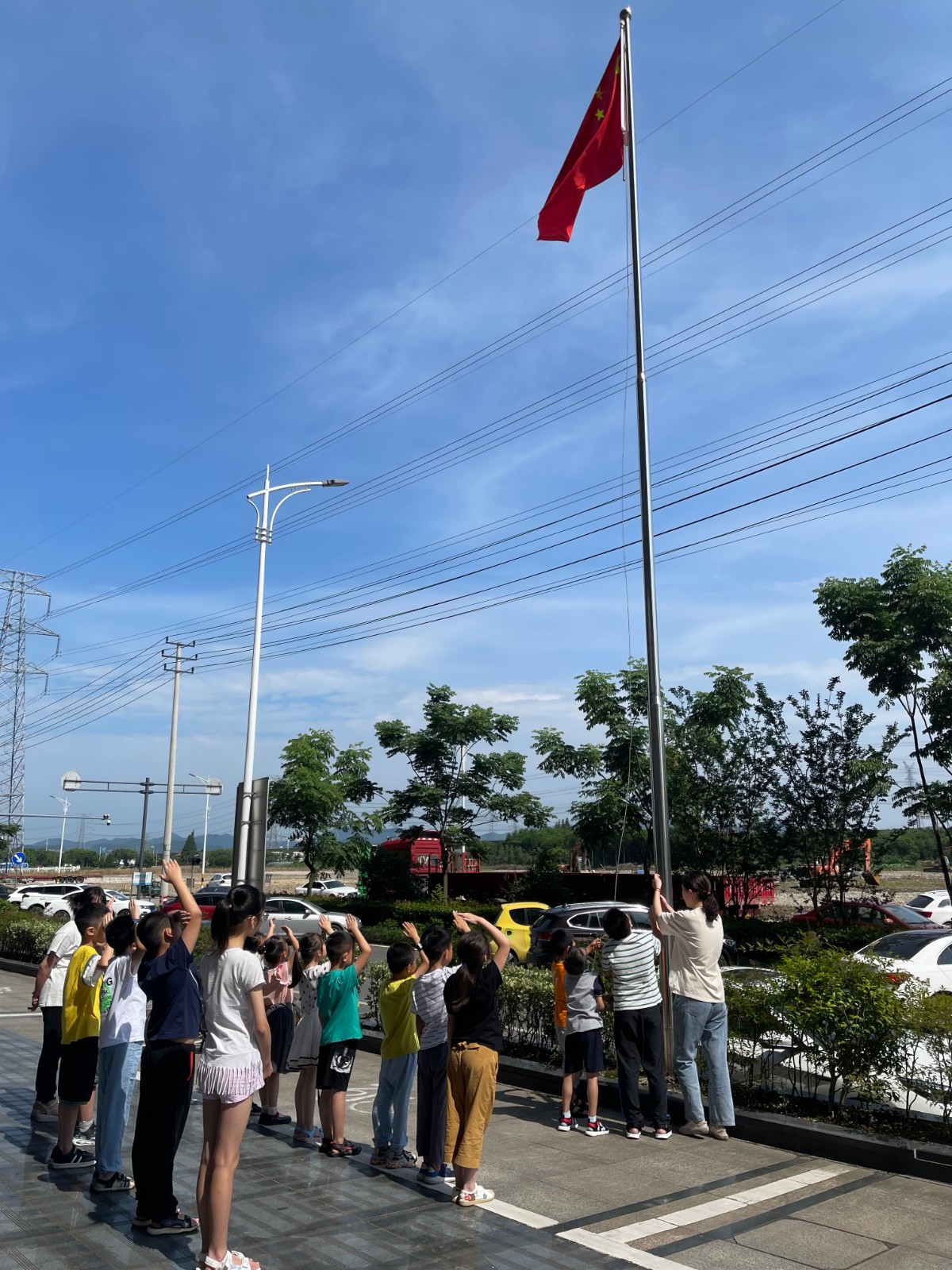 首先小朋友们进行了自我介绍,相互熟悉,社区门口进行了升旗仪式,三个小朋友自告奋勇做起了升旗手,其余小朋友站的笔直向国旗敬礼或行注目礼。