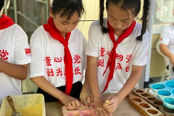 活灵活现的十二生肖手工玩偶,深深吸引了同学们的注意力,大家不禁敬佩起现场这些阿姨的心灵手巧。金团的制作过程更是让同学们有了从未有过的体验,在几位阿姨的指导下,包馅儿、裹松粉、压模具,一个个香喷喷的金团在孩子们手上成型,甚是诱人。