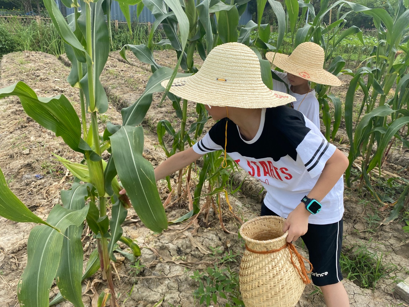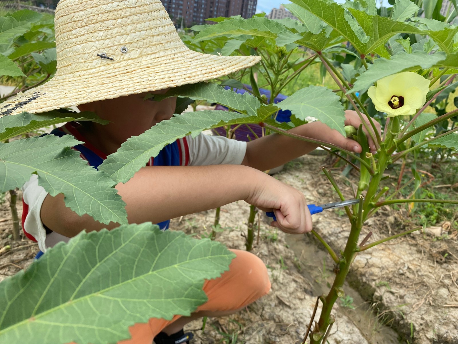 在老师的带领下,小朋友们来到了田恬圈自然教育社,老师先为大家介绍了蔬菜品种以及采摘技巧。在采摘活动过程中,小朋友们都使出浑身解数,摘玉米、剪秋葵、拔南瓜、摘豇豆……一个个勤劳的身影在田地间穿梭,将采摘的农作物全部放进自己的背篓里,收获满满。