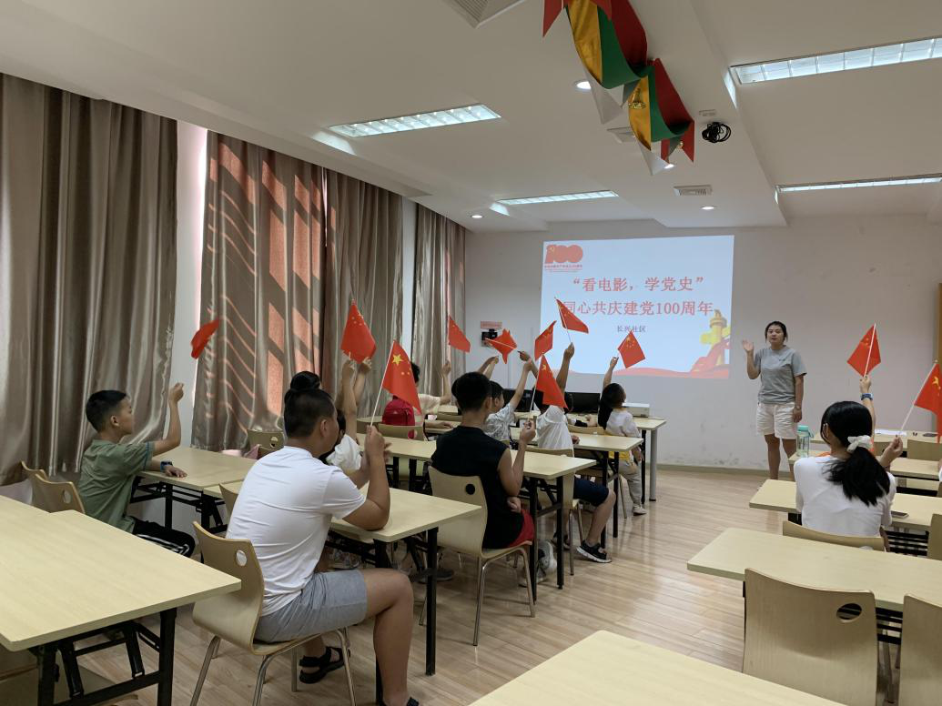今年是中国共产党建党100周年。为培养社区青少年的爱党爱国情怀、陶冶思想道德情操,树立正确的世界观、人生观、价值观,7月15日上午,长兴社区假日学校开展以“看电影学党史,同心共庆建党100周年”为主题的党史教育活动,20位青少年参与本次活动。