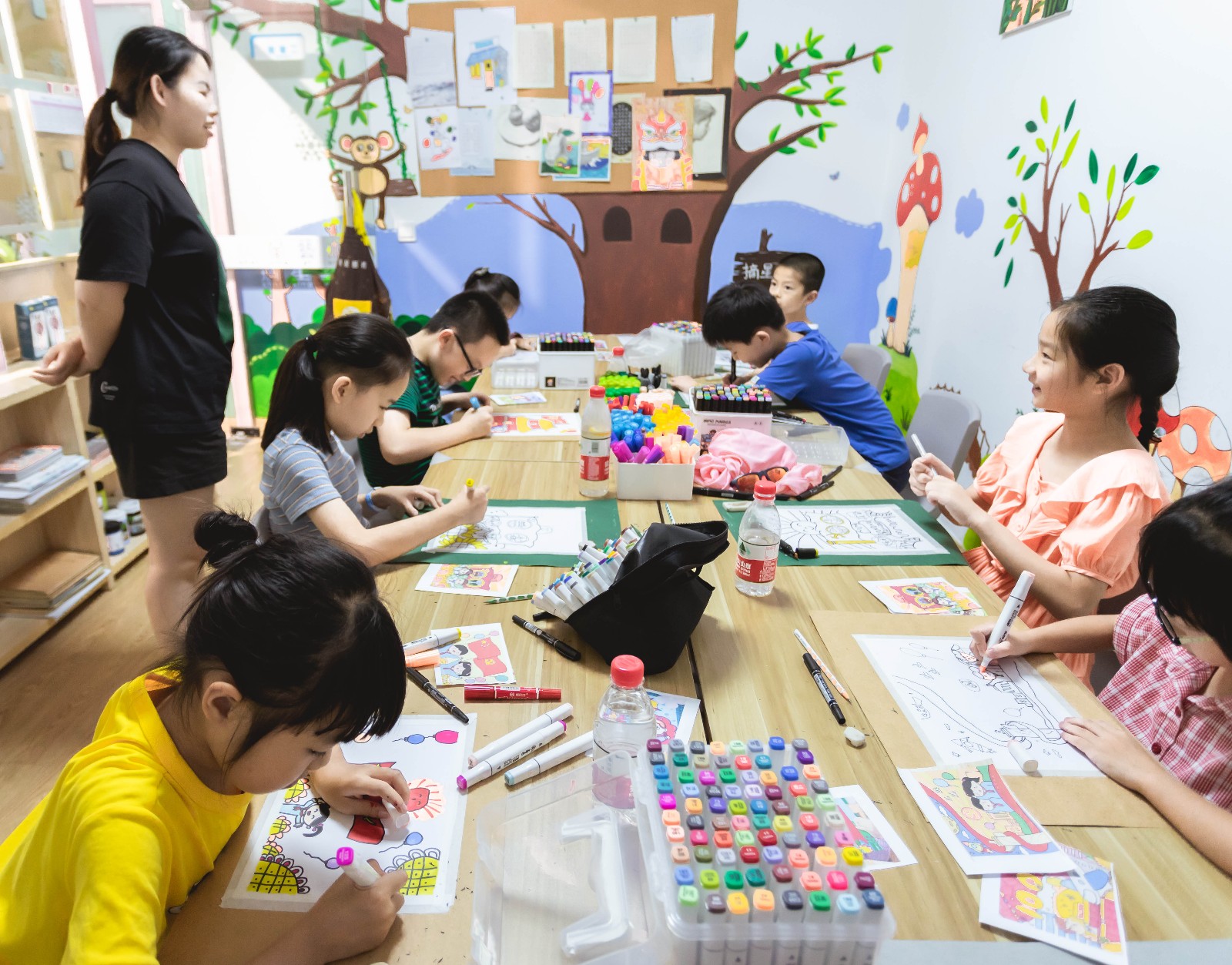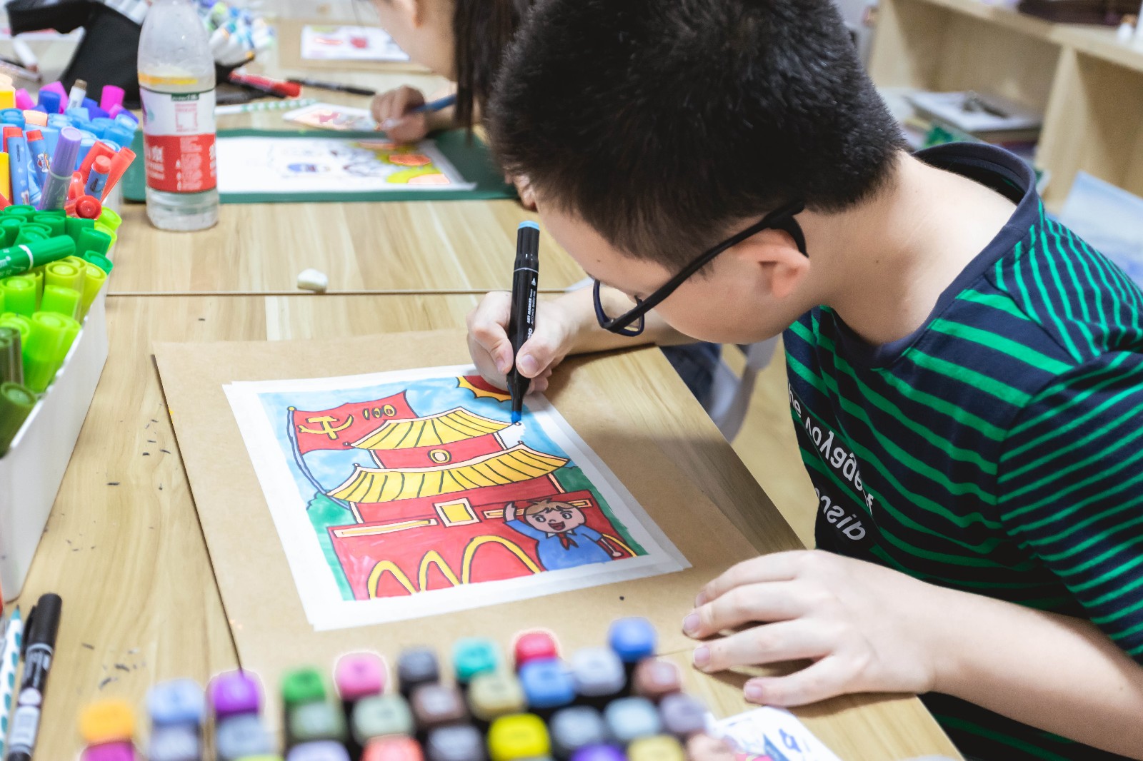 孩子们在画室老师及社工的指导下,运用手中的画笔,巧妙的勾勒出迎风飘扬的党旗、蜿蜒曲折的巍巍长城等各式各样的图景,用稚嫩的笔触描绘自己眼中的祖国盛世和心中的美好生活。