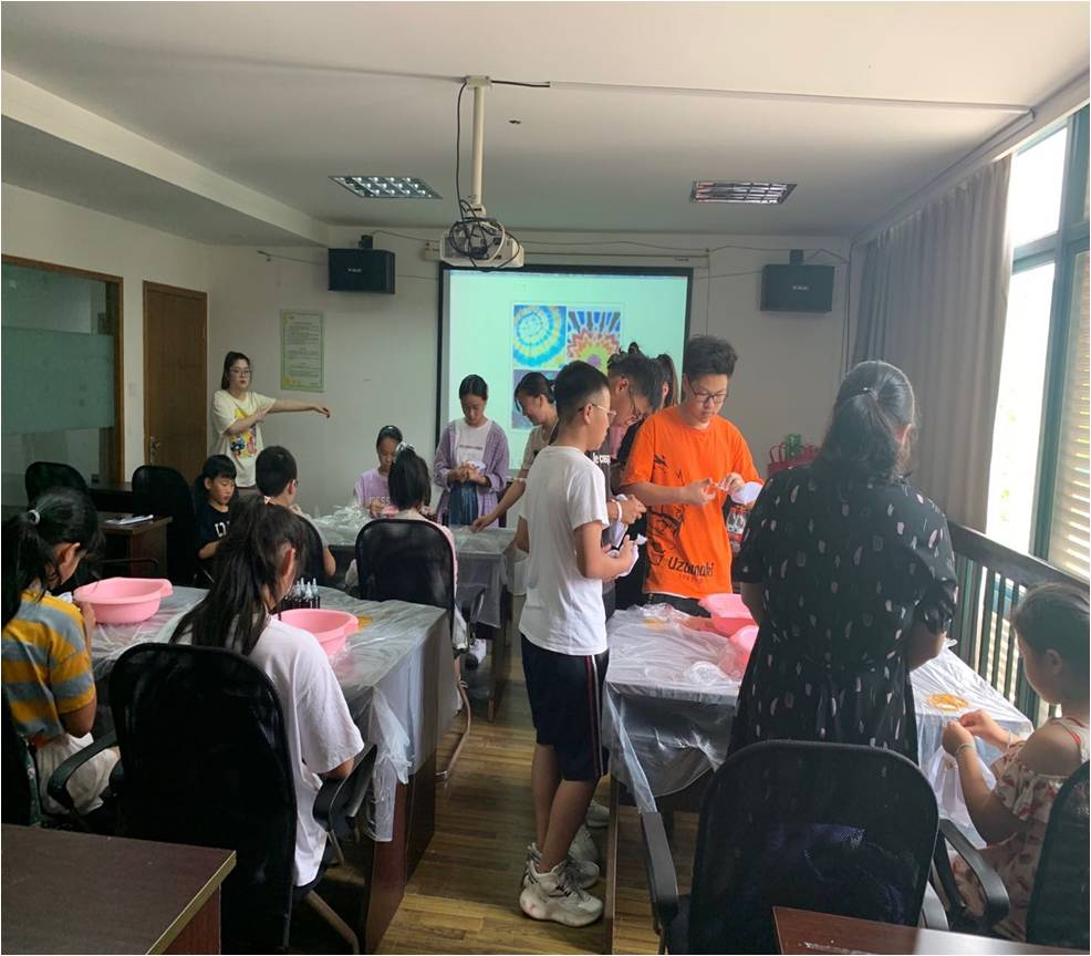 7月15日下午2点,宁沁社区假日课堂之“古法艺术扎染“活动在市民学校如火如荼的开展。