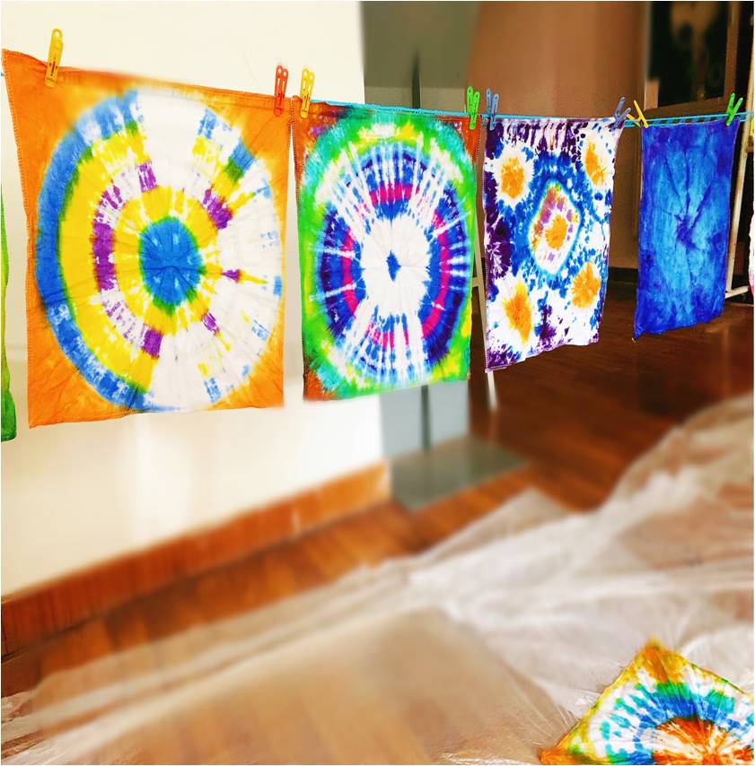 首先老师教学生们制作步骤,虽看似简单的两三步,每人制作出来的作品却形色各异。学生们在操作过程中,脸上洋溢着笑容,眼神中透露着执着,每一滴汗水都是他们认真参与的表现。不多时,扎染成品一一亮相,有的是渐变色,有的似圆盘,更有孩子开玩笑的说;“像个煎蛋!”