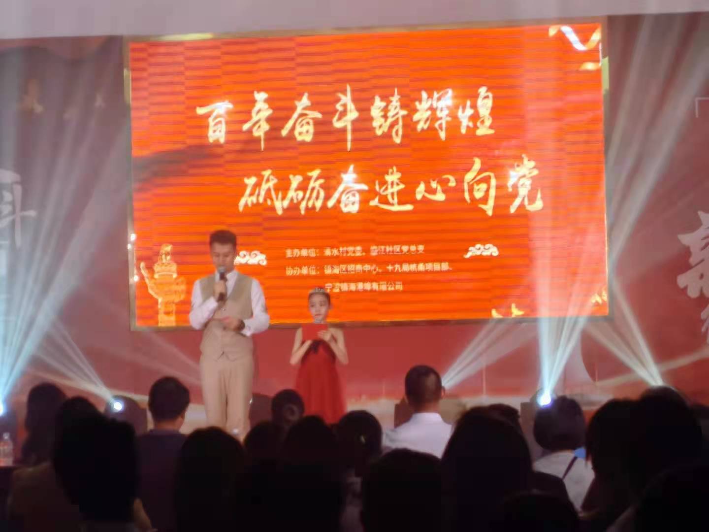 为庆祝中国共产党成立100周年,深入开展群众性爱国主义教育活动精神,清水浦村党委联合临江社区、区招商中心、十九局铁路项目部、宁波镇海港埠公司于近日举办了“百年奋进铸辉煌,砥砺奋进心向党”文艺晚会。