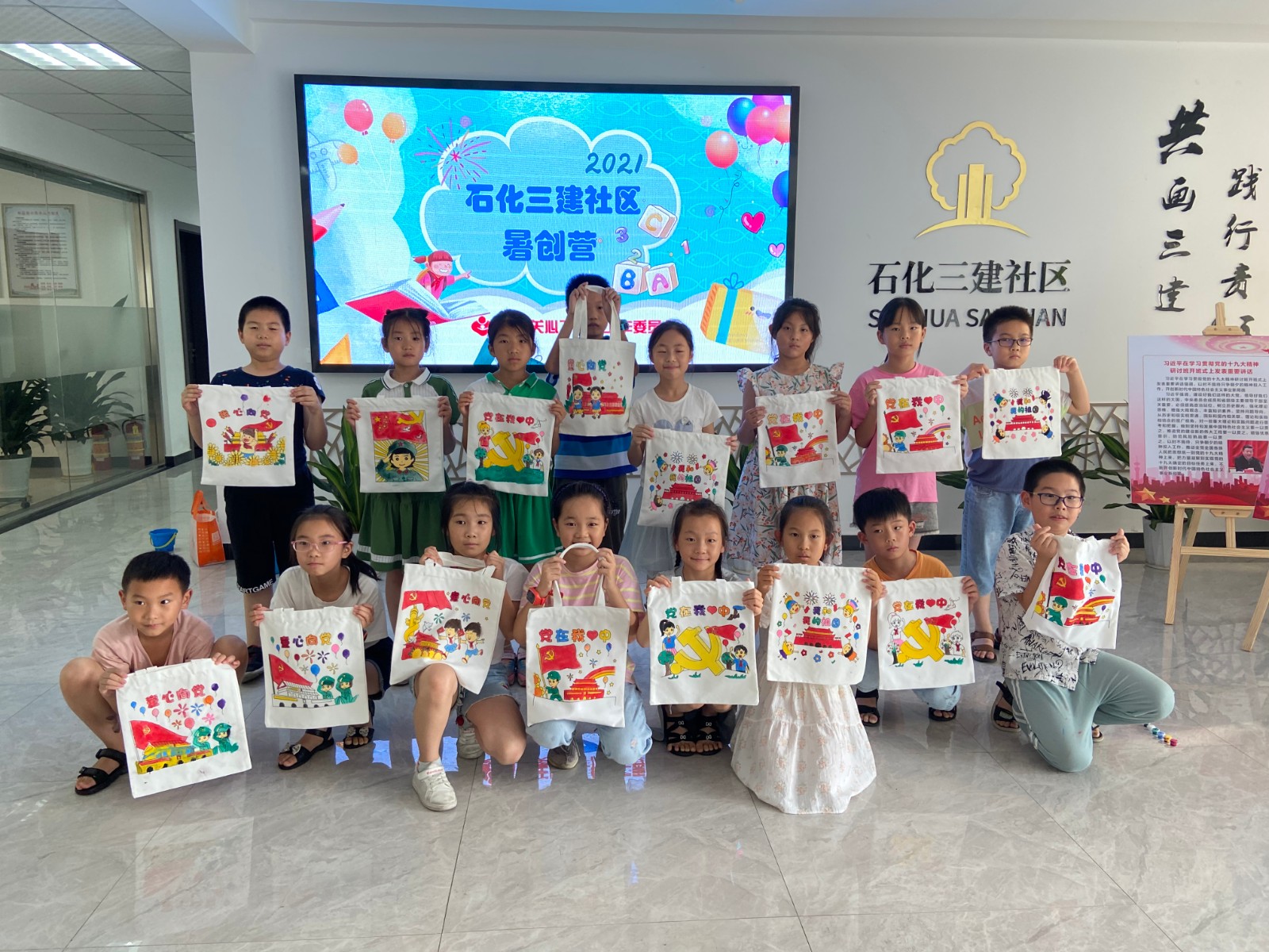 今日下午,石化三建社区“暑创营”第四课邀请到社区“建美艺社”志愿者老师与小学生们一同完成DIY帆布包绘画。