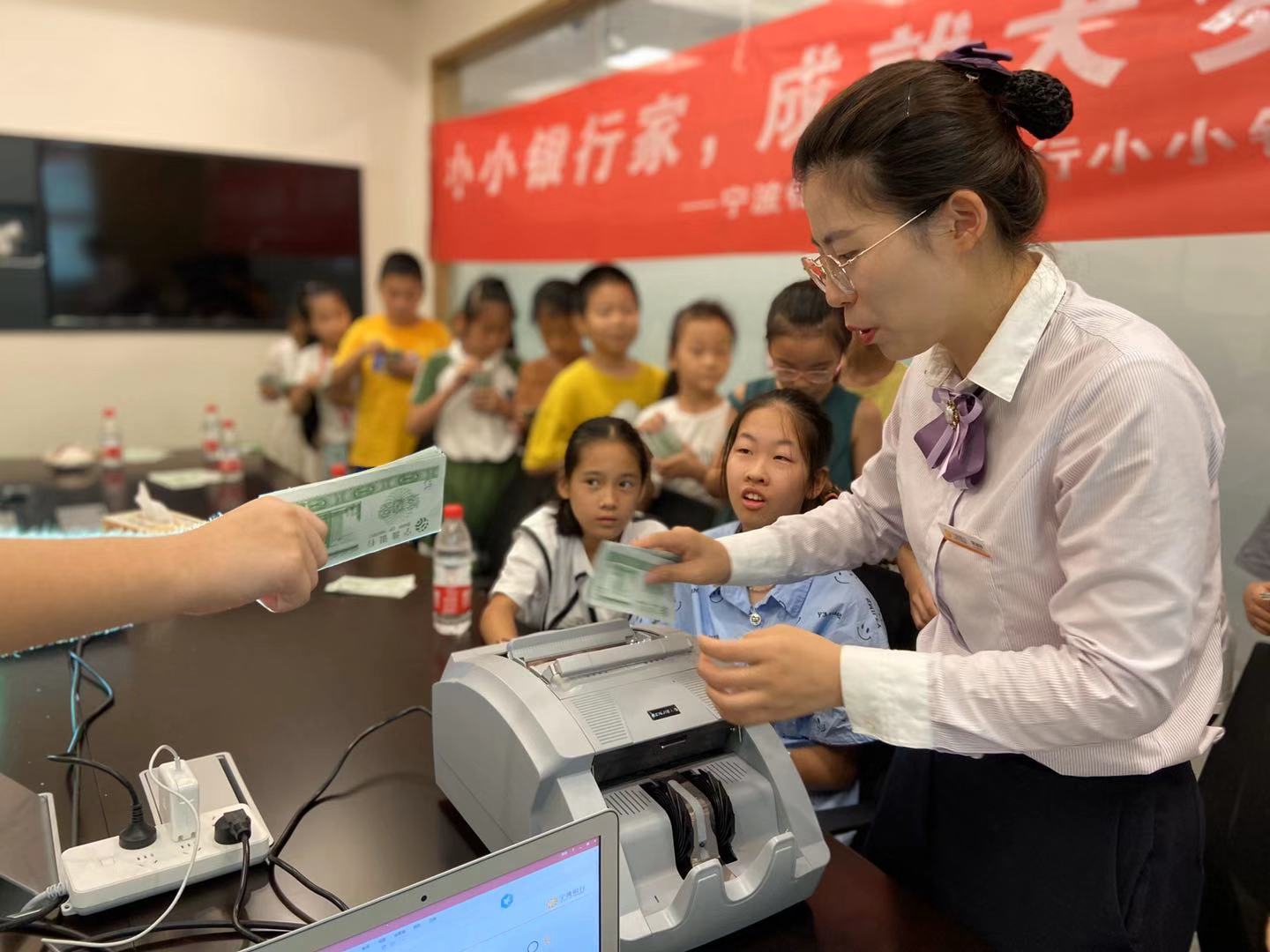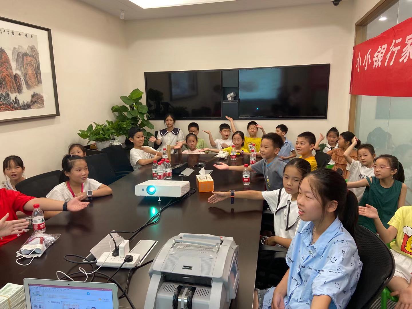 首先,孩子们到达活动室上了一堂“小小金融家”的课,学习和了解了简单的金融知识并进行数钞PK,孩子们在寓教于乐的氛围中学习金融知识,以理论与实践相结合,让孩子们参观了便捷先进的金融自助设备,并亲自操作体验业务自助办理流程。