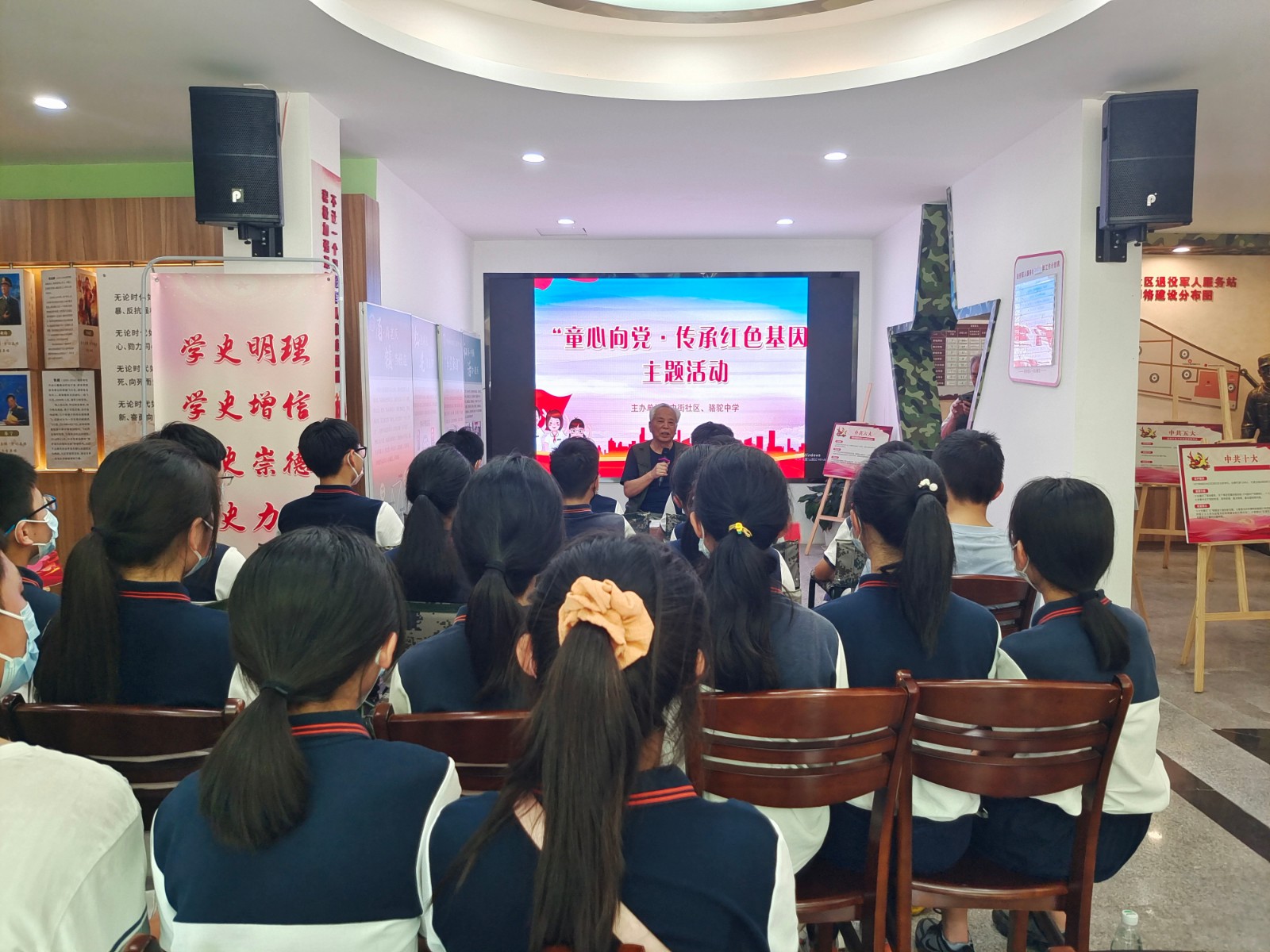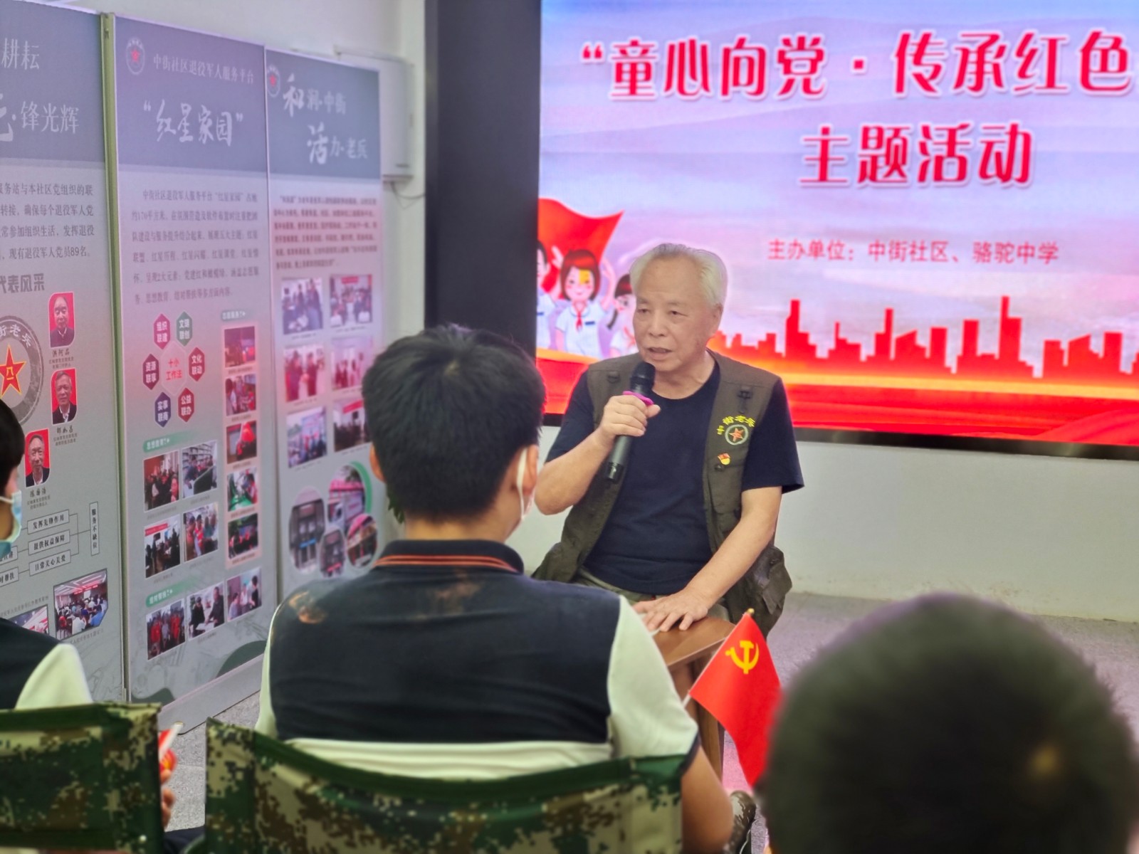 为深入推进青少年党史学习教育,激发青少年爱国情感,传承红色基因。近日,中街社区积极开展丰富而有意义的实践活动,引导未成年人从党史中汲取思想养分,推动革命基因、薪火精神代代相传。7月30日下午,中街社区联合骆驼中学以“童心向党.传承红色基因”为主题,开展了退伍老兵和青少年学生的互动。首先由退伍老兵王文浩带来一趟生动的党课,讲述他当兵时做一个通讯兵的经历和入党50多年的感悟。而后由退伍老兵张康道带领着学生们诵读《学百年党史 传红色基因 做新时代奋斗者追梦人》。最后由退伍老兵张海兴领唱,大小牵小手同场一曲《没有共产党就没有新中国》。通过此次活动,激发了学生们的民族自豪感、责任感以及爱党爱国之情,让红色基因代代传承。