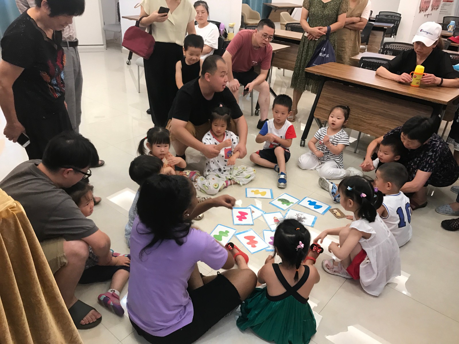 课堂上,外教和翻译老师互相配合采用图片与单词相结合方式,通过卡片游戏,让孩子们在游戏中学习英语。为消除小朋友的陌生感,老师通过做游戏的形式带动现场气氛,课堂上热闹非常。