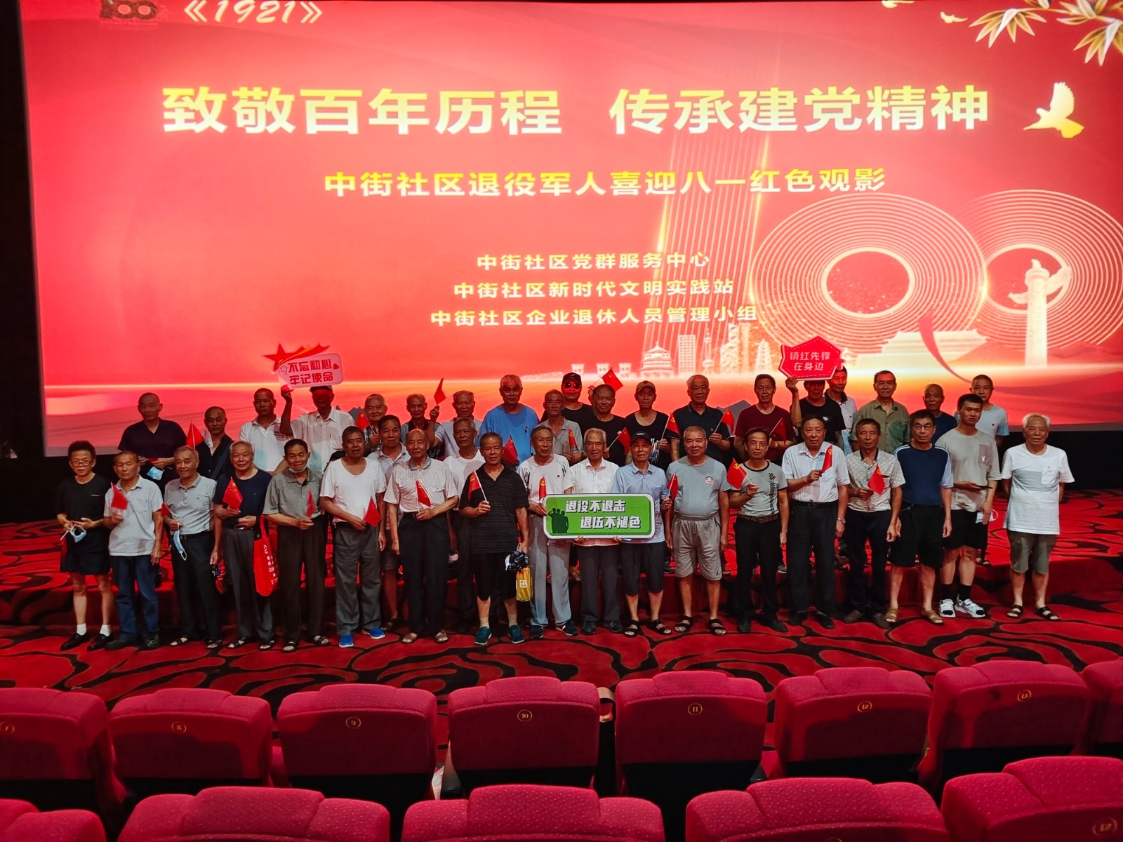 在“八一”建军节当天,中街社区邀请了在籍户口70余名退役军人,举行“传百年记忆.承建党精神”观影活动。为进一步了解我党历史,学习共产党人艰苦奋斗的革命精神,本次活动播放影片《1921》,电影让大家重温了革命先辈们的牺牲精神,了解到在中国共产党的建党史上,革命者们流血牺牲的付出。观影后,全体人员一致表示,要倍加珍惜军人们用生命换来的和平年代和幸福生活,发扬爱国主义精神,充分发挥军人的模范带头作用。此外在“八一”建军节到来之际,中街社区为现役军人家属送去慰问品和节日的祝福。共计走访慰问现役军人家属3户,加强了社区同现役军人家属的交流,密切了军民关系,促进了军民双拥共建工作。
