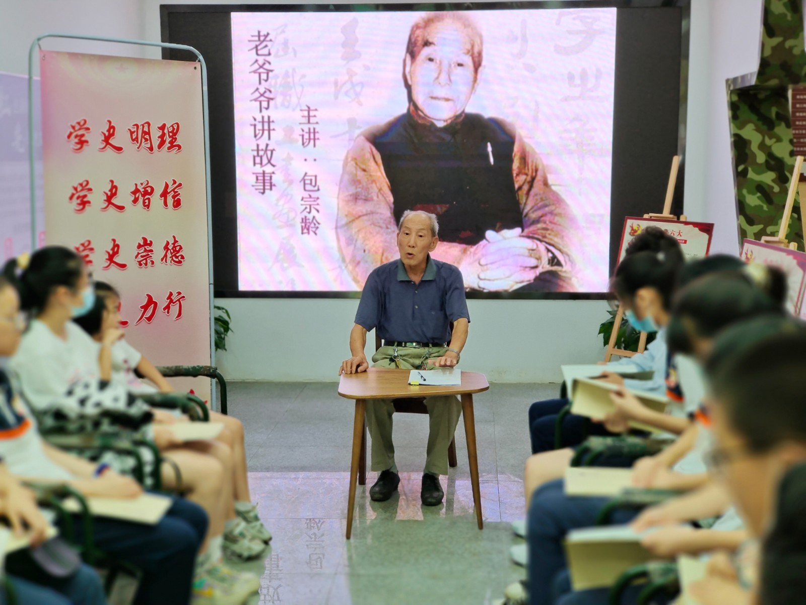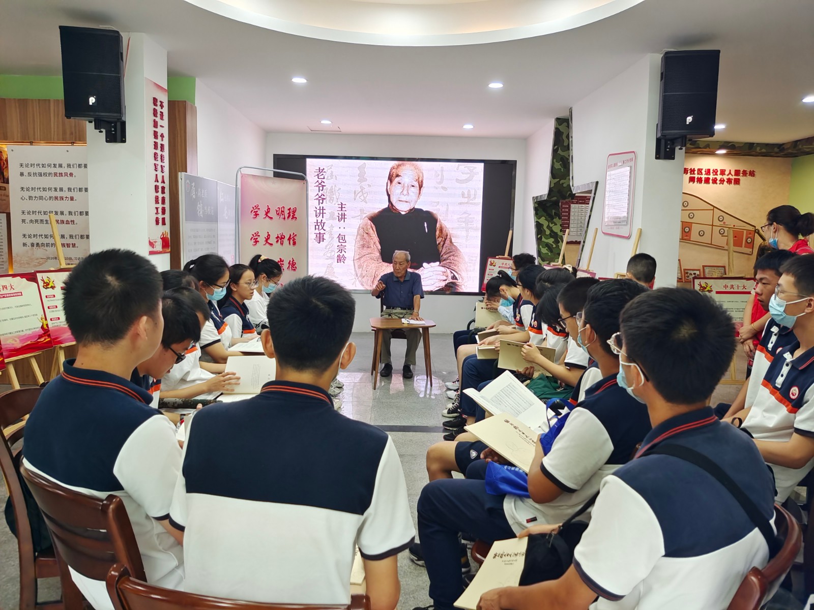 8月6日下午,中街社区组织骆驼中学学生到退伍军人服务站开展“侨台故事会——听包爷爷讲故事”活动。故事讲述者,是年近80多岁的老侨眷包宗龄。当老爷爷遇到“小鲜肉”,开启一场跨越半个多世纪“文化烙印”对话。包宗龄既是台属,也是侨属。他清楚记得,1949年他10岁时,舅舅在码头上被抓壮丁去了台湾。直到38年后,包宗龄才和舅舅重聚。在回忆了当年恨和爱交织的时光后,包爷爷重点讲述了翁伟年、赵安中等骆驼籍侨胞的爱国故事。最后包爷爷还将自己写作的《骆驼桥走出来的书法家》一书赠送给学生。”包宗龄表示,希望能够通过这堂故事课,将老一辈党员的初心与使命传递给青年学生,带动大家共同为祖国做贡献。