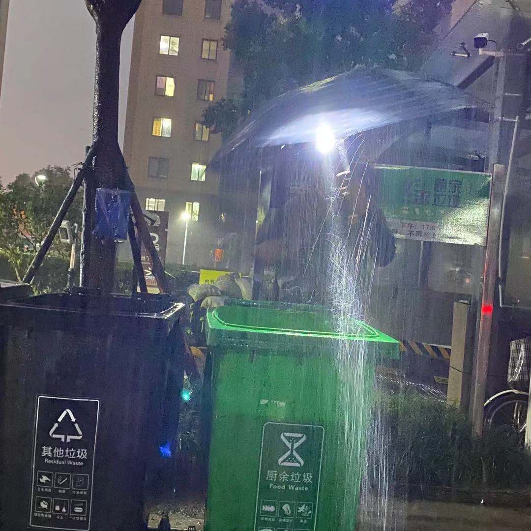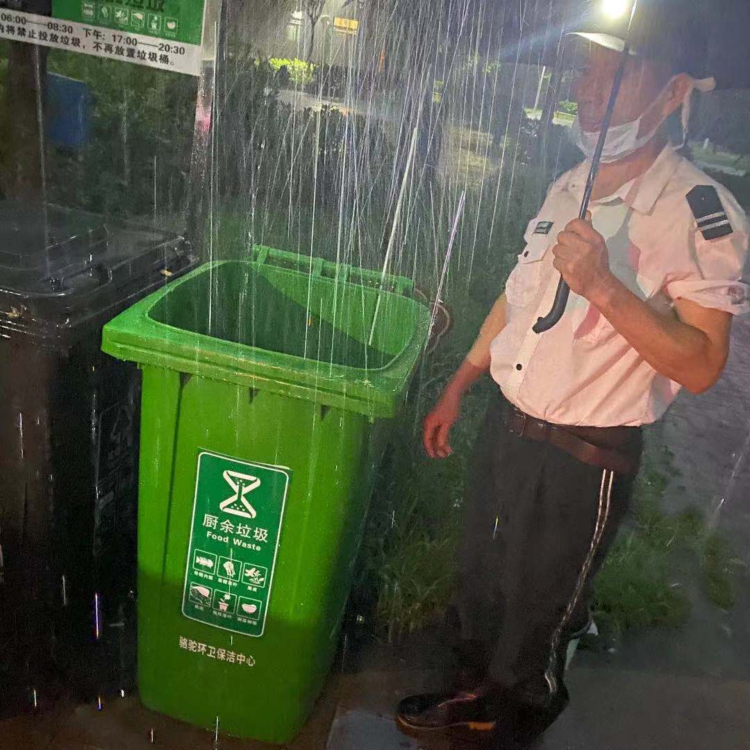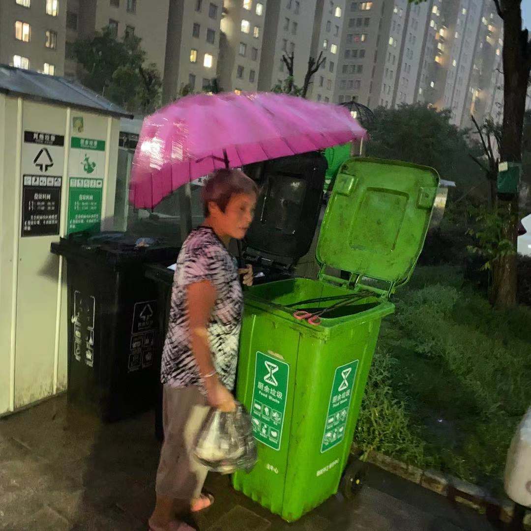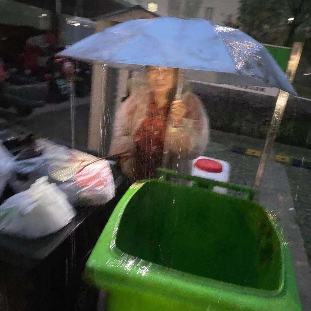 今日大约六点多,突然开始下暴雨,一会儿工夫有些低洼地带已经有积水,管理垃圾分类的成员仍然兢兢业业坚守岗位,仅一把雨伞,撑起一方小天地。