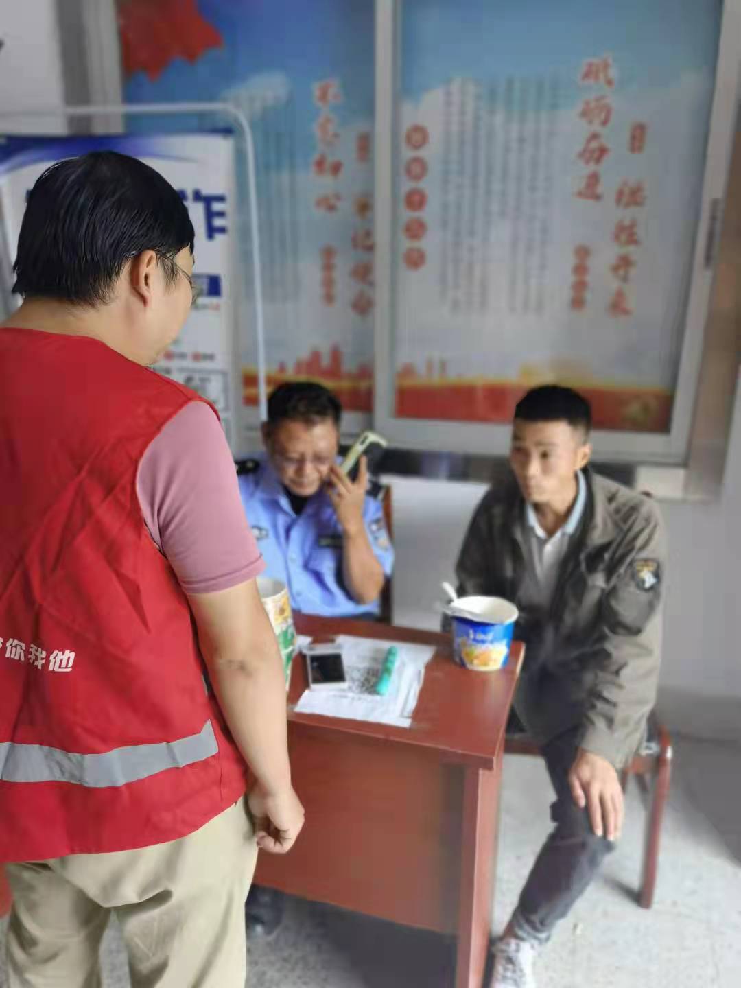 乘着小曾吃饭的间隙,网格员和辅警老陈仔细询问了他的户籍地址、目前在宁波有无亲戚、朋友等信息。起初,小曾还不太愿意与网格员沟通情况,但看着大家关心的眼神,小曾终于开口了,他说他是几天前跟着他人到宁波找工作,但几天下来,没找到合适工作,身边钱也用尽,宁波这边也没有亲戚和朋友可以借宿的。室外雨大风急,眼看天色也要晚了,这如何是好?