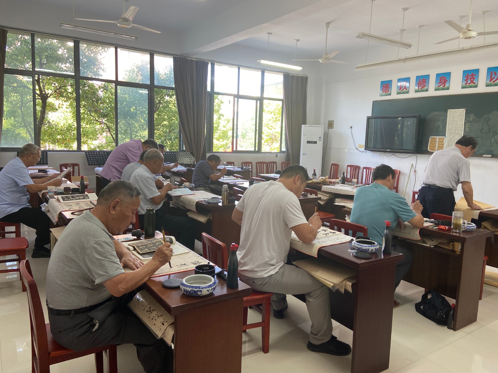 本学期书法班由赵顺峰老师授课。赵老师对本学期书法专业班的课程设置、集中培训安排、实训安排向学员作了布置。课堂上,赵老师巡视教室一周后,对学员们在练习过程中出现的细小问题一一作了细致讲解,提醒学员们在书写每一个字的时候要重视章法。老年学员们学习热情高涨,迫不及待地执笔舞墨,认真对照,互相探讨书法的奥妙,互帮互学,还不时向赵老师讨教一些自己练习中遇到的问题尽情享受着书法的乐趣。