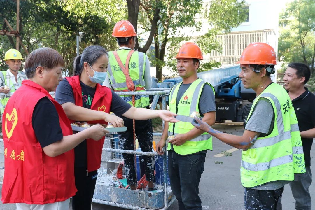“每逢佳节倍思亲”,中秋节是团圆的日子,但对于很多在坚守在一线岗位的工人们来说,为了坚守岗位,他们无法与家人团聚。志愿者们带着新鲜出炉的月饼来到锦江花园老旧改施工现场,为工人们送上一份特殊的节日祝福。施工人员何师傅表示:“之前天气热的时候社区送来绿豆汤,现在中秋节也要到了,没想到会收到这么好看又好吃的月饼,社区真是把我们当成家人一样关心。”老旧改施工何师傅在收到月饼后忍不住发出赞叹。