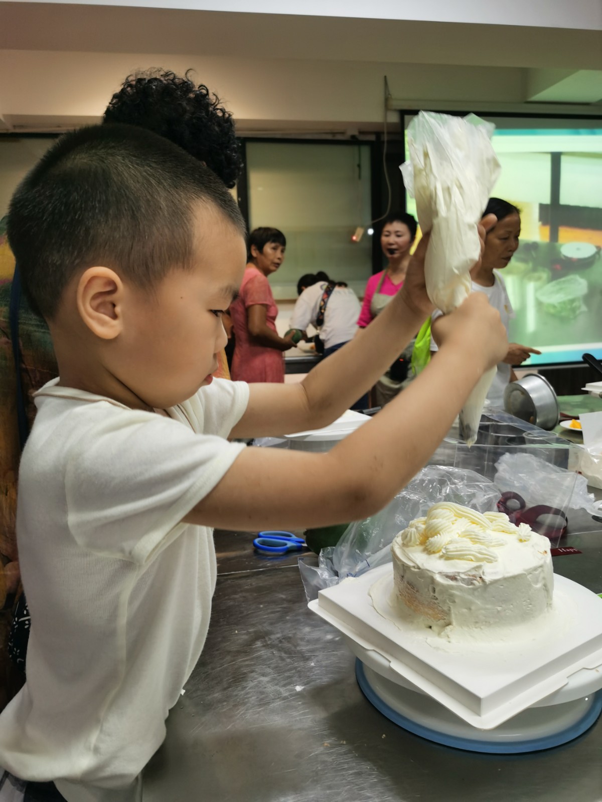 活动现场,志愿者们早早地准备好了面粉、奶油、牛奶、鸡蛋、芒果等原材料。小朋友们测温、消毒等疫情防护举措以后,进入会场。看到满桌子的材料后,跃跃欲试。在糕点师的耐心讲解和指导下,小朋友们按照讲解步骤随爸爸妈妈制作蛋糕,称量、打蛋白、搅拌面粉,虽然动作略显生疏,常常出现分量不够等问题,但活动现场充满了欢声笑语,其乐融融。在大家的密切配合下,香喷喷的蛋糕陆续出炉,互相品尝后大家都赞不绝口。