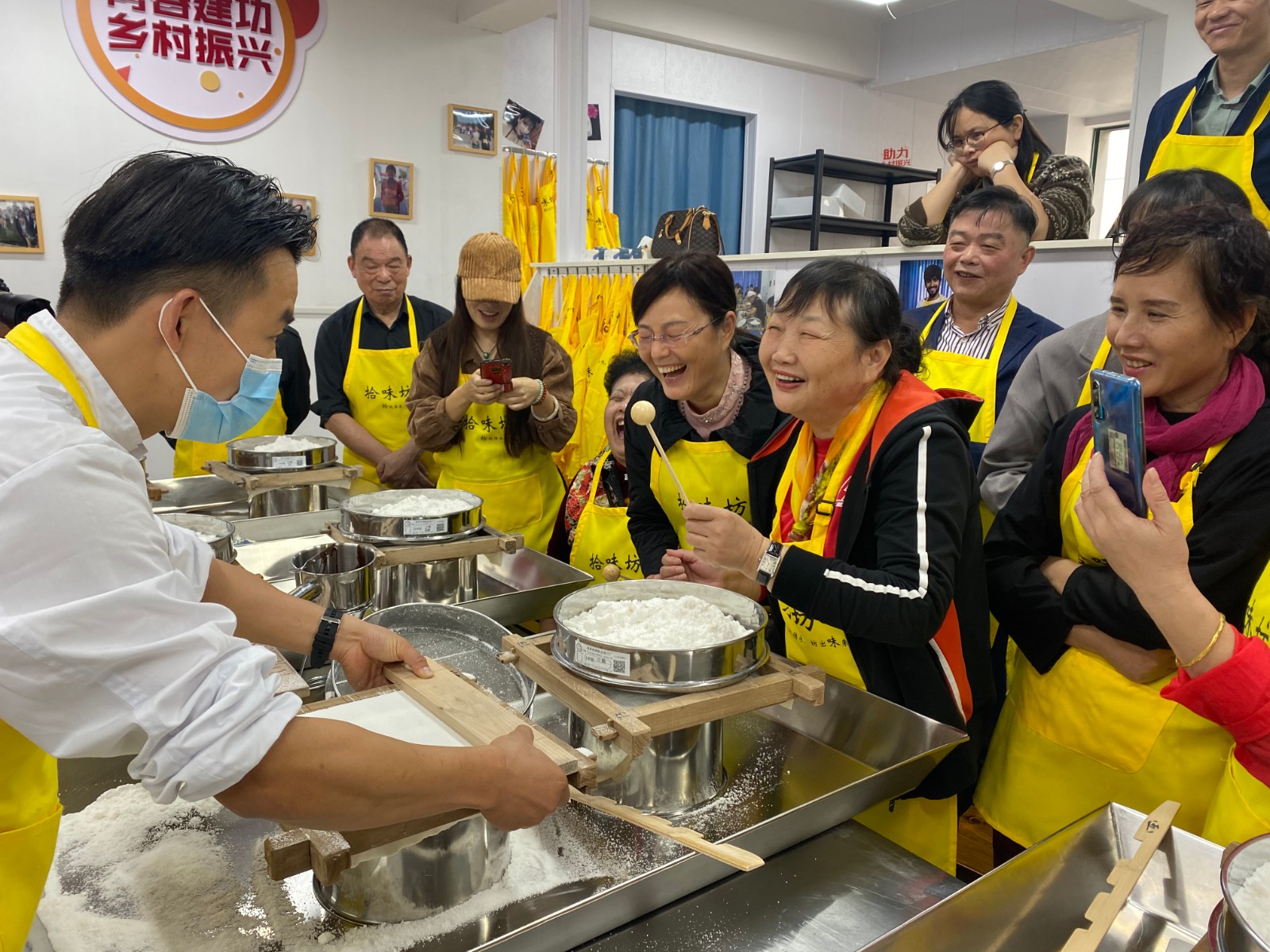 研学第三站,大家来到了梁弄大糕传承世家什味坊。墙上的电视机里,正播放着他们在中央电视台教大咖们做梁弄大糕的视频。然后工作人员开始边演示边用风趣的语言给学员们讲解大糕做法。学员们边听边拍,跃跃欲试。演示完后,大家动手学做大糕。
