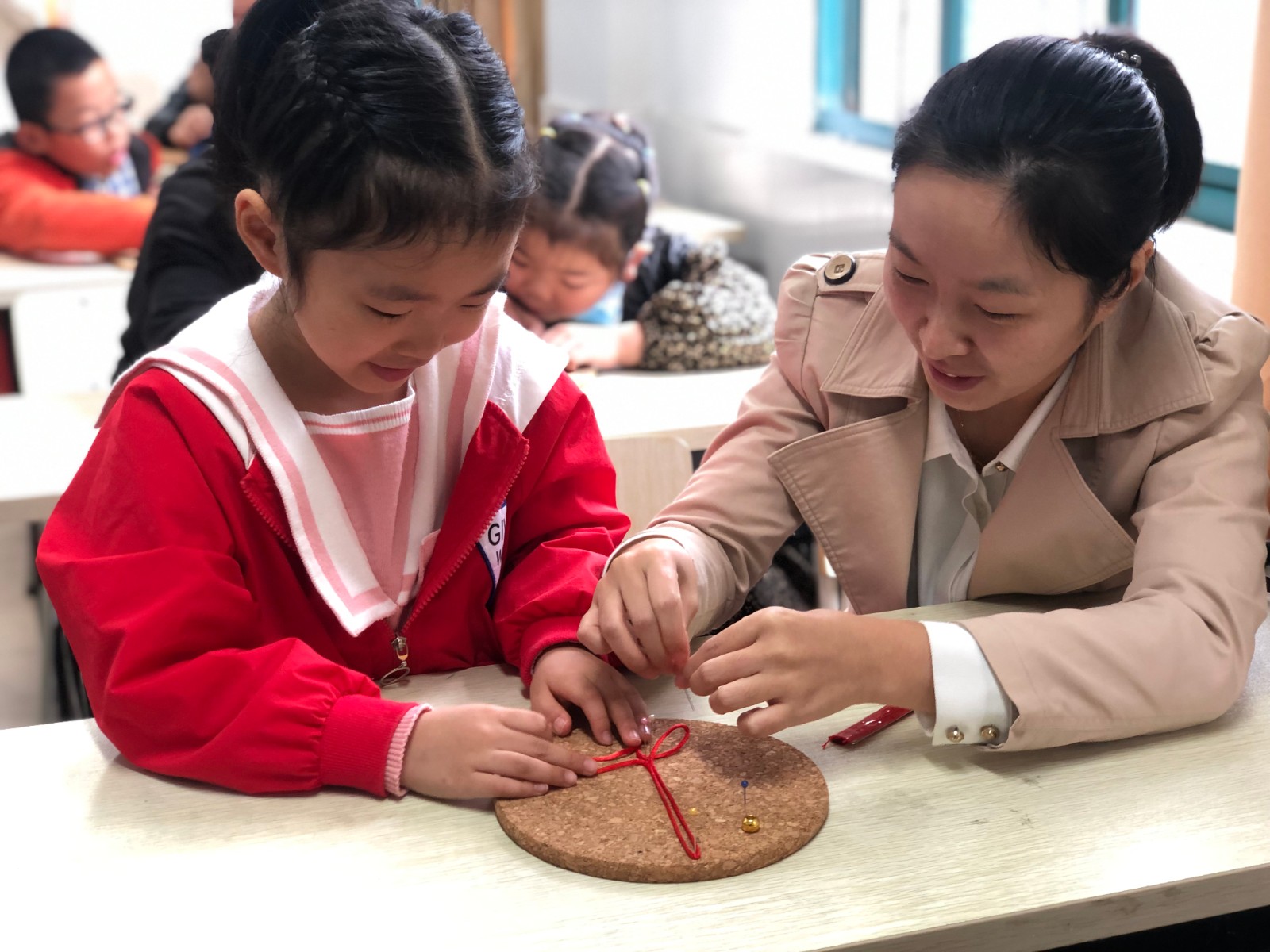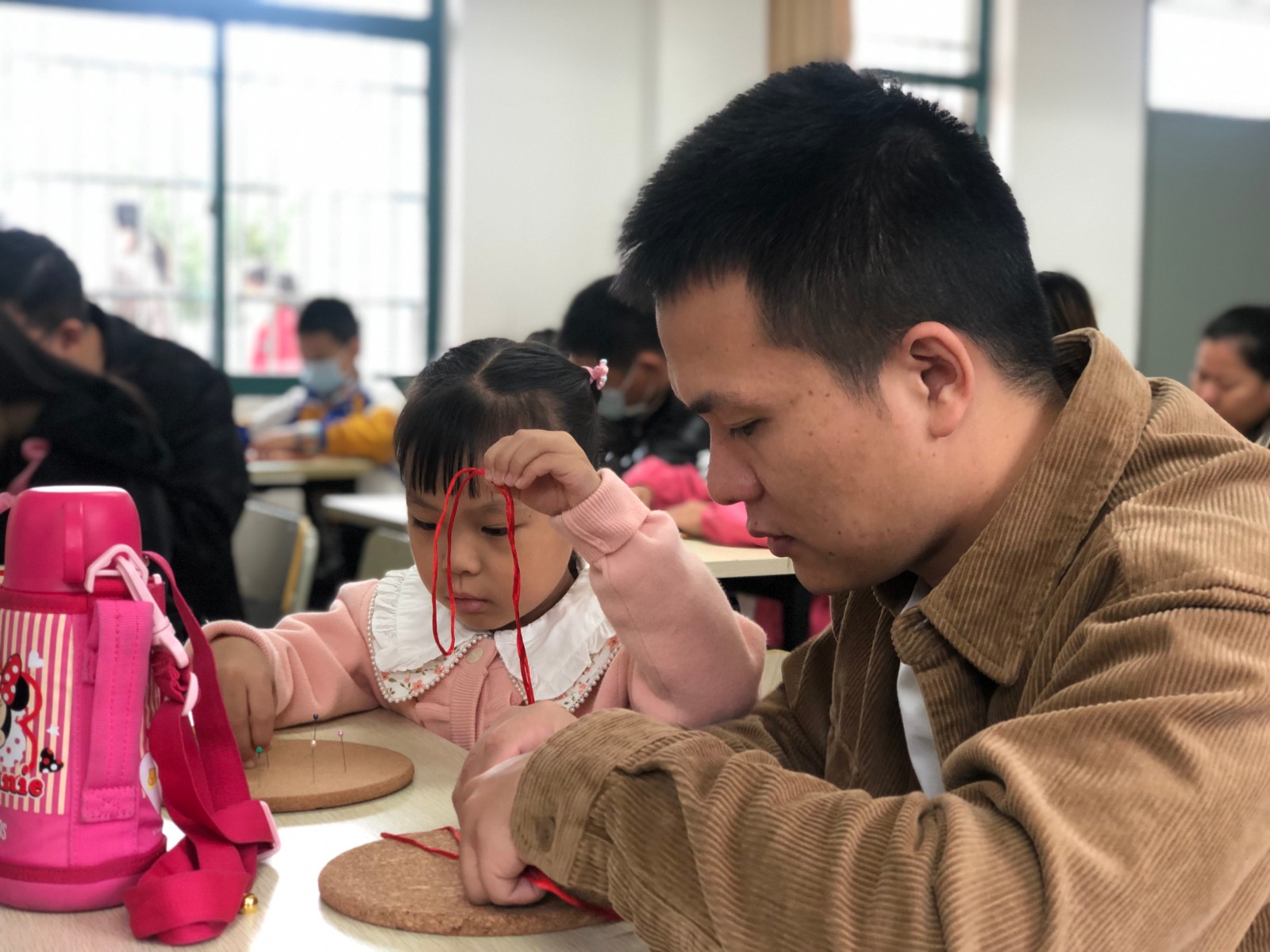 天天气很好,阳光明媚 ,一扫连日的阴霾,不由的让人的心情也大好。在小港成人学校,青墩社区邀请区文化加油站的老师孙人建老师来帮助完成一堂亲子编制中国结的活动课。