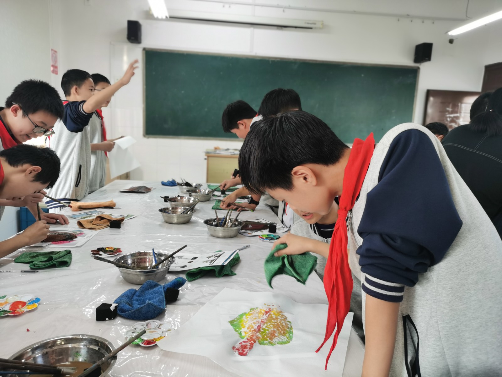 鱼拓卢圣贵老师带了满满一箱多宝鱼,从拭干鱼体到上色,再到拓印、“拓鱼点睛”,最后作品呈现,让在座的男孩子们眼前一亮,不时响起一阵阵掌声。在老师的巡回指导下,男孩子们的鱼拓作品也陆续呈现,大家在学习实践的过程中热情洋溢,成就感满满。