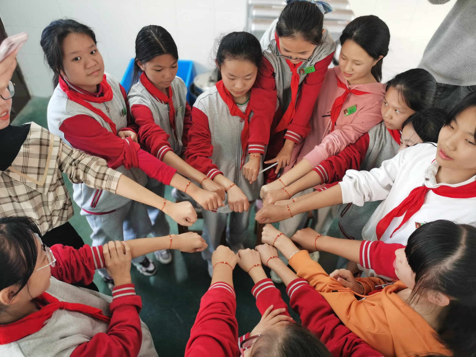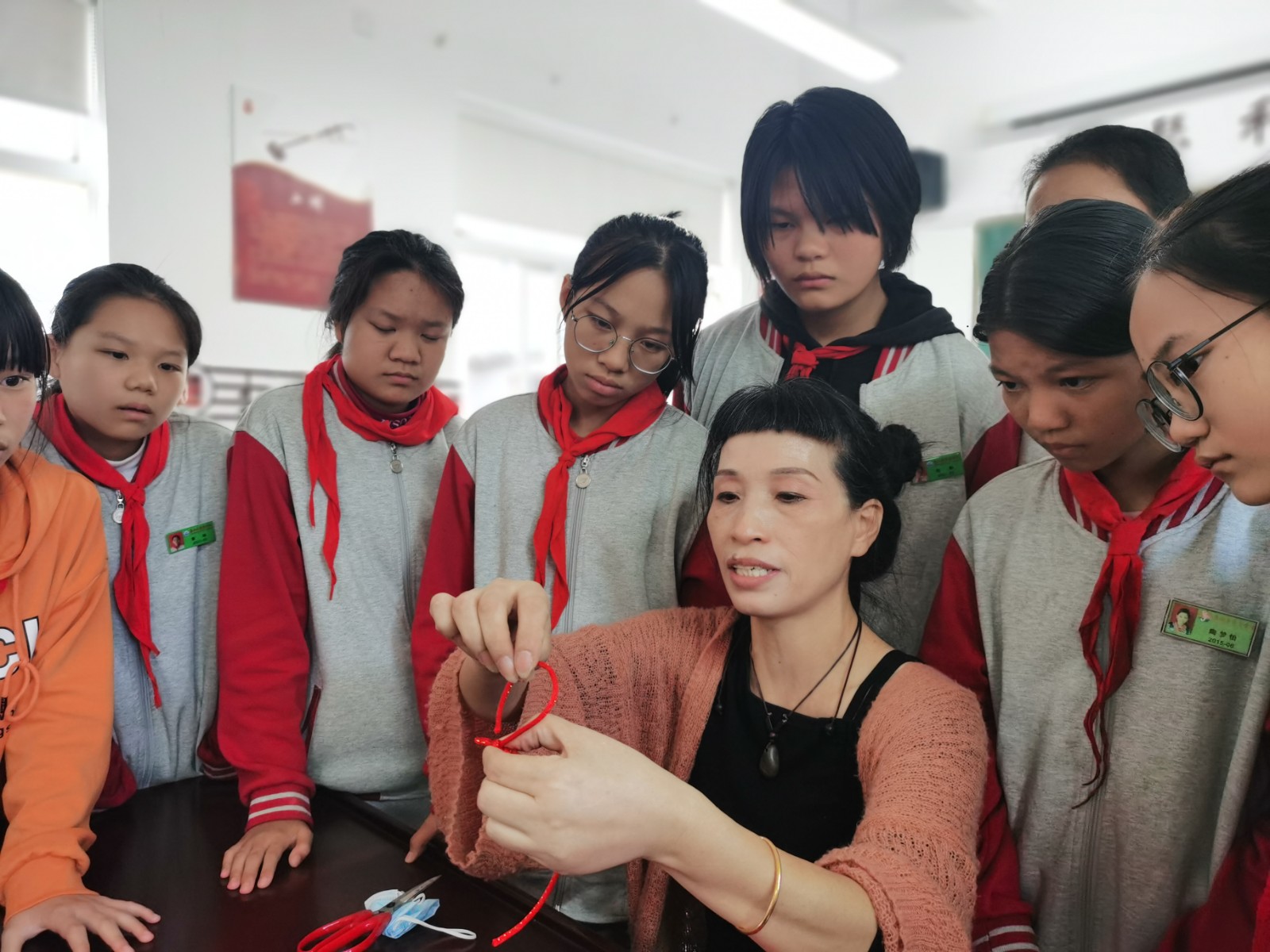 在 “编结技艺”课堂上,女孩子们人手一根镶着金丝线的红绳,围在裘亚素老师身边,静静地听着老师讲述编如意结的方法和要点,在裘老师几次示范指导下,也开始动手学习打如意结。可是看看简单,真的要做起来,却难了。好几个女孩子编结失败,于是,裘老师再进行一对一,一对二,一对三的指导。最后每人戴上了自己编的如意结手环,激动之余,一女孩子说:“古代的人好聪明,能编出各种各样的好看的结,老师,下次你还来,再教我们编各种各样的结!”