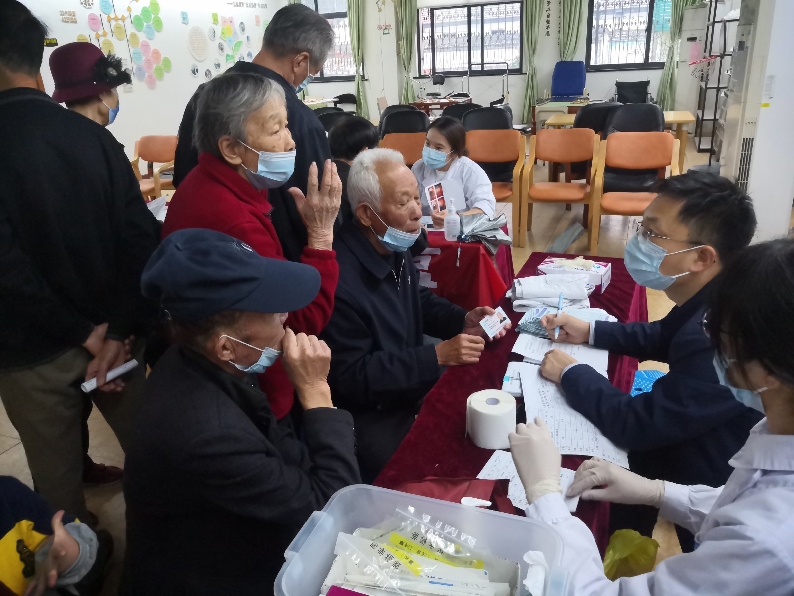 在活动室内,前来的老人排起了长队,测视力表、检查白内障情况、核酸检测,在工作人员的指引下,整个活动有条不紊,现场氛围热闹非凡。在检查之余,到来的医护人员到来所有老人详细讲解了常见病症的发病情况、发病原因,介绍白内障的种类以及治疗情况并且对可能或已患上白内障的患者进行了现场登记确保社区老人们能够及时到医院接受治疗。随后,医护人员向到场的所有老人分发了白内障的宣传单页还有准备的精美小礼品,赢得老人们一致的好评。