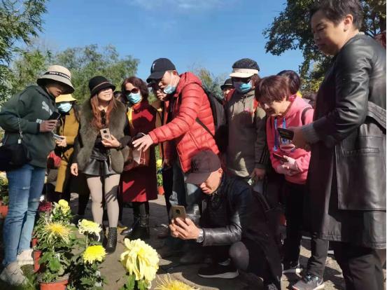 在植物园的兰园中,环境幽雅,淡淡的菊香沁人心脾,争奇斗艳、色彩缤纷的菊花引人眼球 ,可这群或蹲、或趴、或站,举着手机对着菊花猛拍的老人们更是成为兰园里一道独特的风景。他们中有独自拨弄镜头的,有互相摆拍的两人组合,更多的是三五成群围成一堆商量如何取景的,菊花成了他们手机镜头的主角,今天他们要把平时课堂中学到的倒影、延时、快门、九宫格构图、滤镜等拍摄技巧在这里实战演练一番。我们的摄影乌老师则成了全场最热门的香饽饽,刚跟这边学员说好如何构图,那边就有人因为拍不出理想的倒影效果扯着嗓子在求助。望着这群好学又爱美的老学员们,我也忍不住按下了手机的拍摄键。