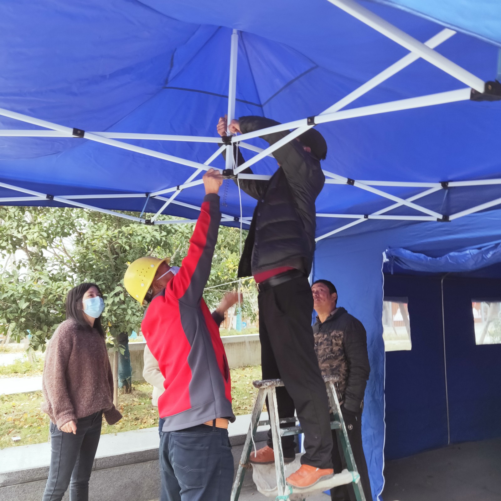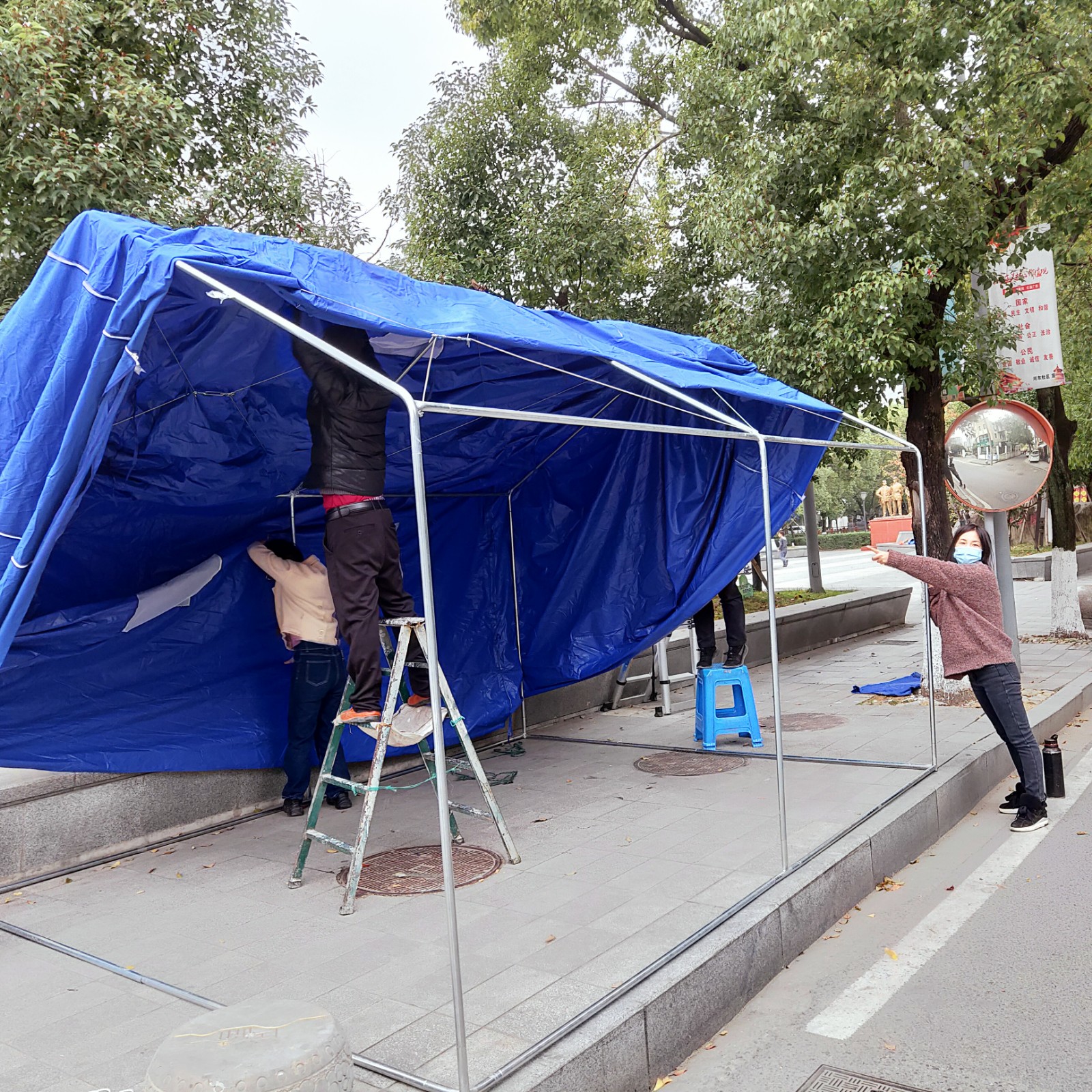 管控小门,严控人口流动,河东路作为车辆、人流的必经之地,社区在河东路主干道搭建了临时帐篷,设立了防疫卡,对来往的车辆和行人进行体温和健康码行程码监测。由于网格长中女生比较多,搭建临时帐篷的时候遇到了不小的困难,这时候有路过的行人一看到,立马跑过来施以援手,原本网格长搭了一上午都没有搞好的帐篷,几个师傅搭立柱,固定顶部,安装防水防风挡布,短短半小时就完成了,事后甚至没喝一口水就走了,让人心里一暖。