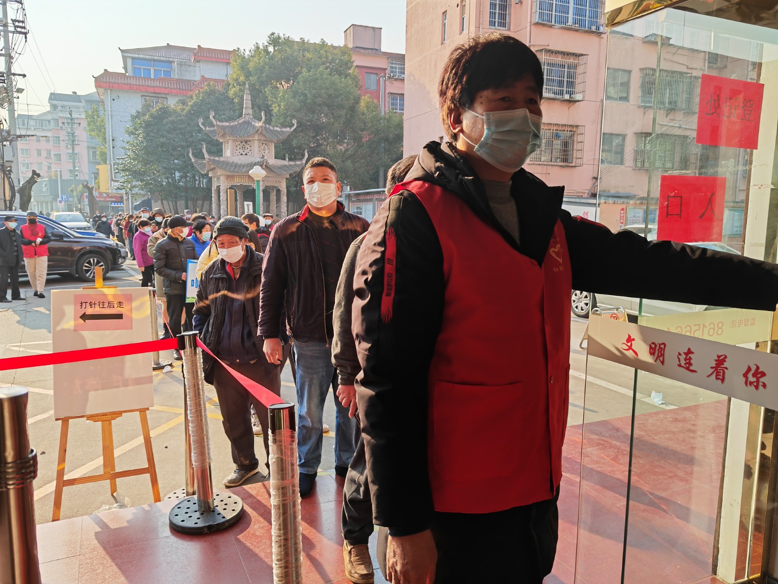 “请大家戴好口罩,出示健康码,带好身份证,有序排队。”红联社区大厅门口,此时排着长长的队伍,“银辉”党员志愿者陈德阳拿着小喇叭正在维护着现场的秩序。为了进一步推进辖区范围居民疫苗接种覆盖率,构建全民免疫屏障,红联社区特别开设临时接种点,进行为期一天的疫苗接种活动。