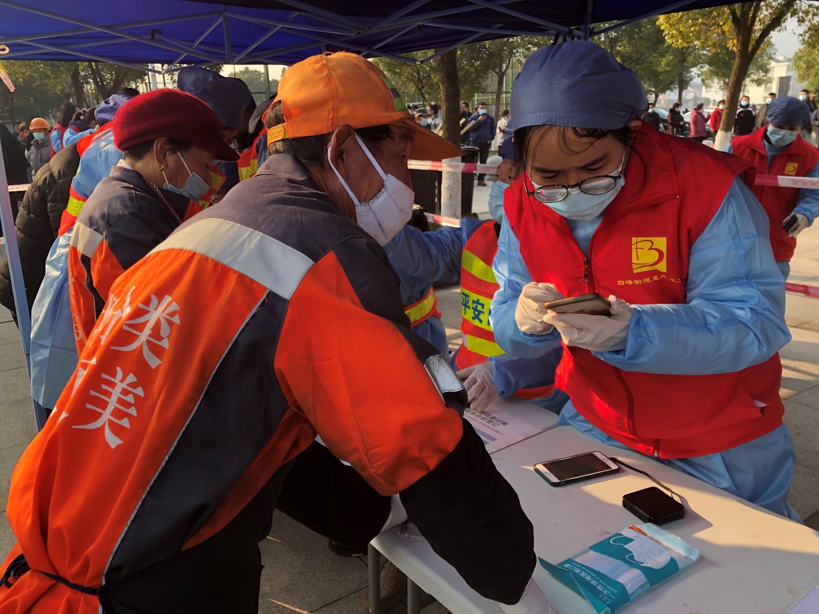 “白峰,全员核酸检测开始了。”冬天的寒风中,正在实习的大学生党员小周已到岗文化活动中心点位,并在微信朋友圈附上一张信息登记图,呼吁大家准时前来做核酸检测。