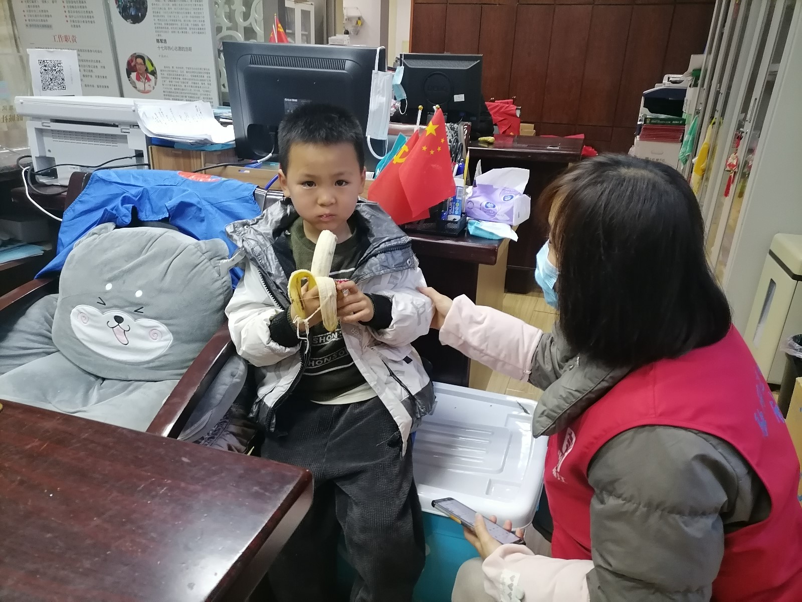 “小朋友,你怎么啦,可以和阿姨说说嘛?”看到哭着上气不接下气的小孩子,周海娜温柔的询问,“我下楼玩耍,上来就进不去了,我要进去,我要外公,呜呜呜呜......”由于小朋友年龄小,说话比较含糊,只知道找外公,说不清楚爸爸妈妈的名字,周海娜帮忙敲了敲门,也没有任何反应,记住楼层后,周海娜将小朋友带到了社区,并给小朋友吃了一个香蕉压压惊,安抚好其情绪后,周海娜就根据记住的楼层打电话,却发现根本不是那户人家。大家齐心协力,一起进行排查,仔细核对,终于发现这个小朋友好像是之前刚从外地搬来的钟某某的儿子,通过电话确认,才知道因为小朋友才来不久,不熟悉导致敲错了门。
