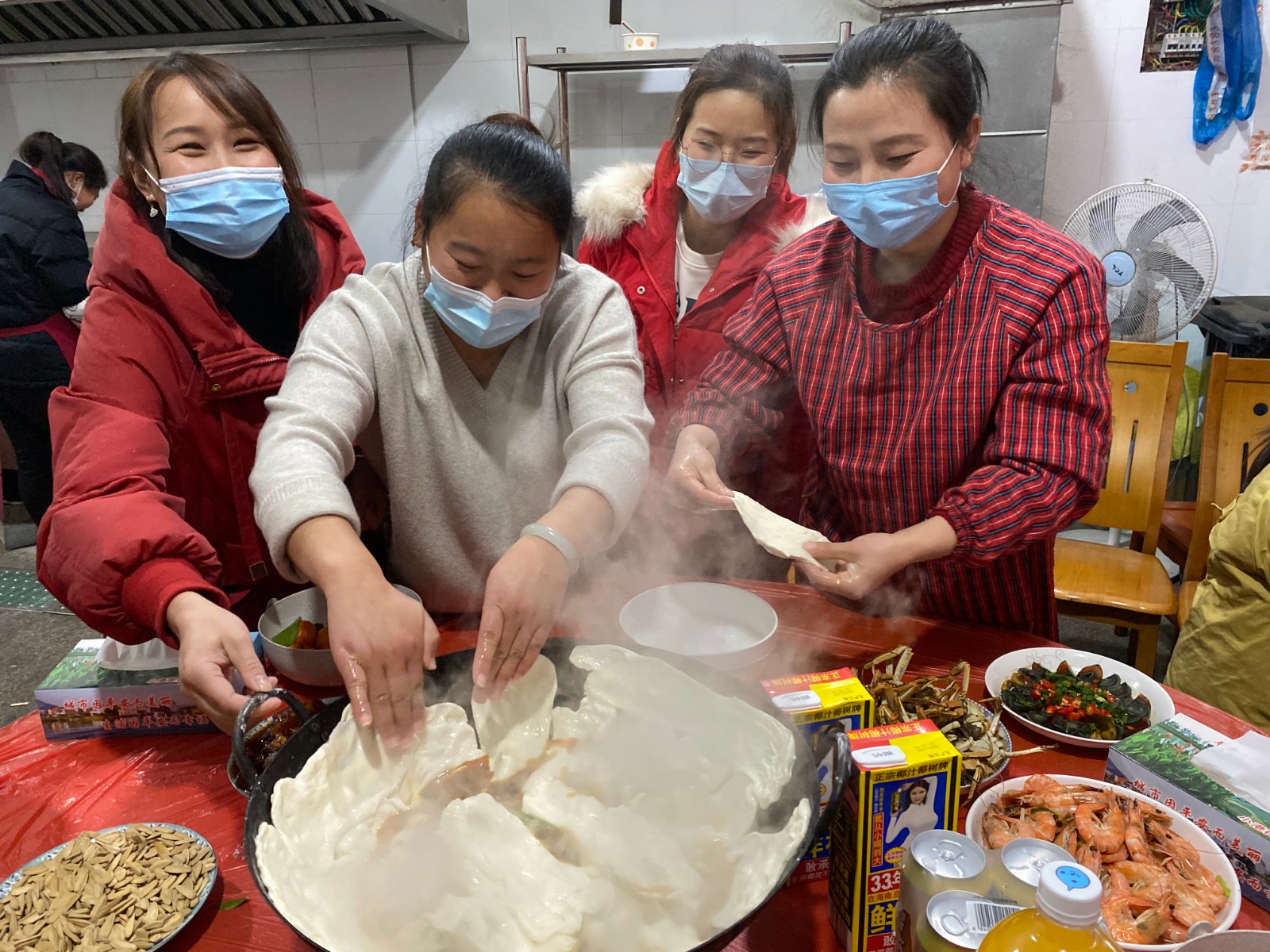 来自安徽的吴友娜已经两年没有回老家过年了,为了响应政府号召留仑过年,每年她都会和社区一起宣传,让更多人留下来过年。连续两年,小范围年夜饭就成为组建宣传队伍的重要平台。由于条件有限,今年只叫来了平常参加志愿服务比较多、积极性比较高、贡献力量大的几名成员,既是让大家有个温暖的迎新氛围,也希望能通过这些骨干力量将留甬留仑的政策宣传出去。