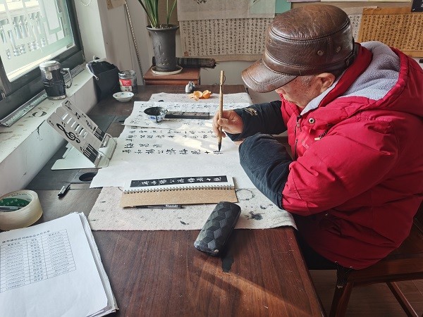 书画协会会长戴源鑫总结了2021年度社区书画协会参与的各项活动及所得荣誉,并对来年的协会发展寄托了新的期望,鼓励大家要以优异成绩为动力再接再厉,焕发“老骥伏枥 志在千里”精神,大踏步走进新一年。书画协会的会员们也对一年来各自取得的成绩进行总结和交流,对今后充满了希望,纷纷表示会不断加强自身学习,继续发挥光热,为书画协会和社区做力所能及的事。交流结束后,大家研墨、铺纸、写字、作画,端坐在桌子旁聚精会神地练习书画,会长戴老师一边写字,一边为学员讲解要领。