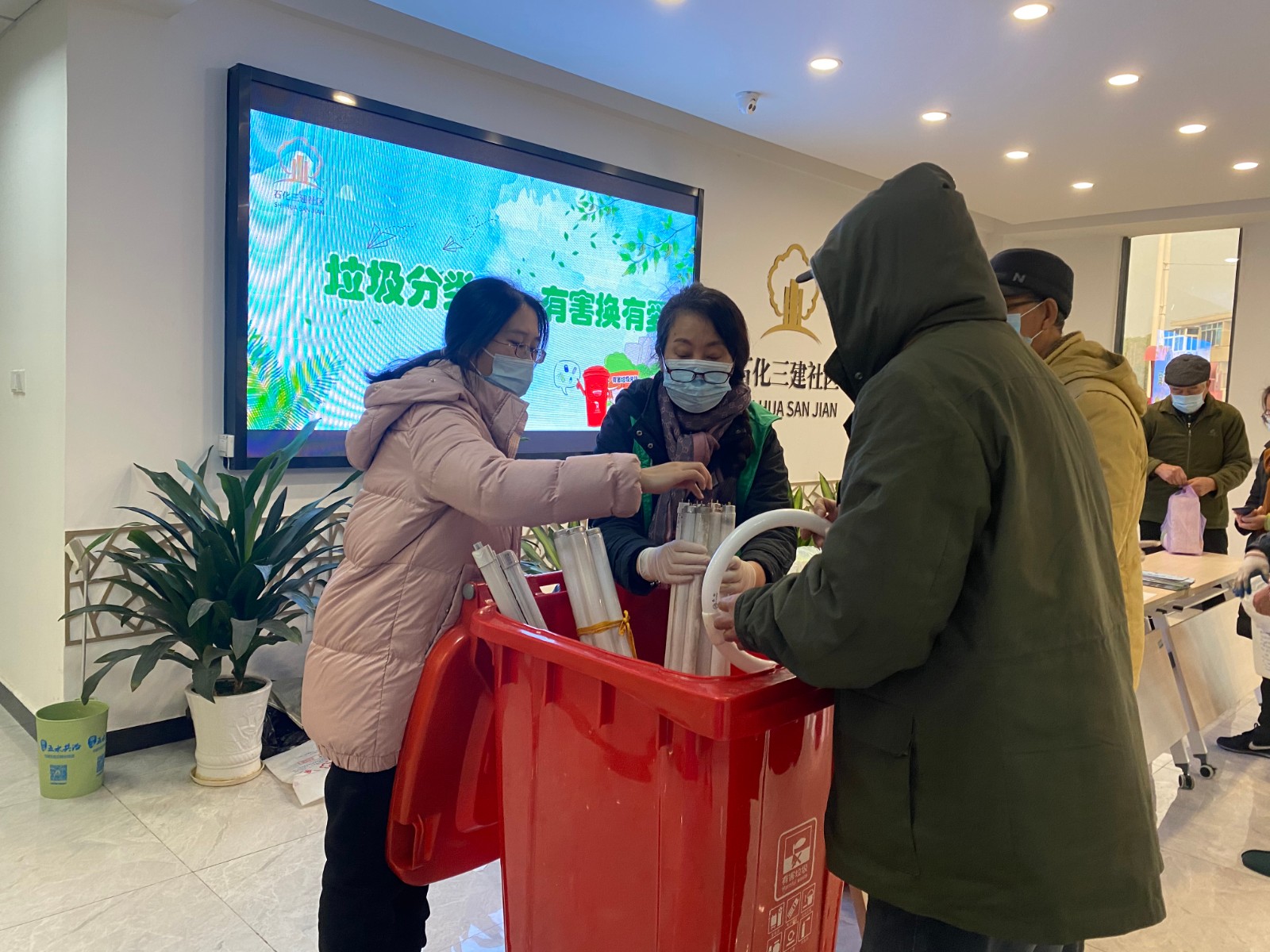居民们纷纷将家中过期药物、废旧灯管、过期化妆品和墨盒等有害垃圾带来社区兑换。同时,石化三建社区的志愿者们向居民分发和介绍《浙江省生活垃圾管理条例》,讲解了条例的主要内容。